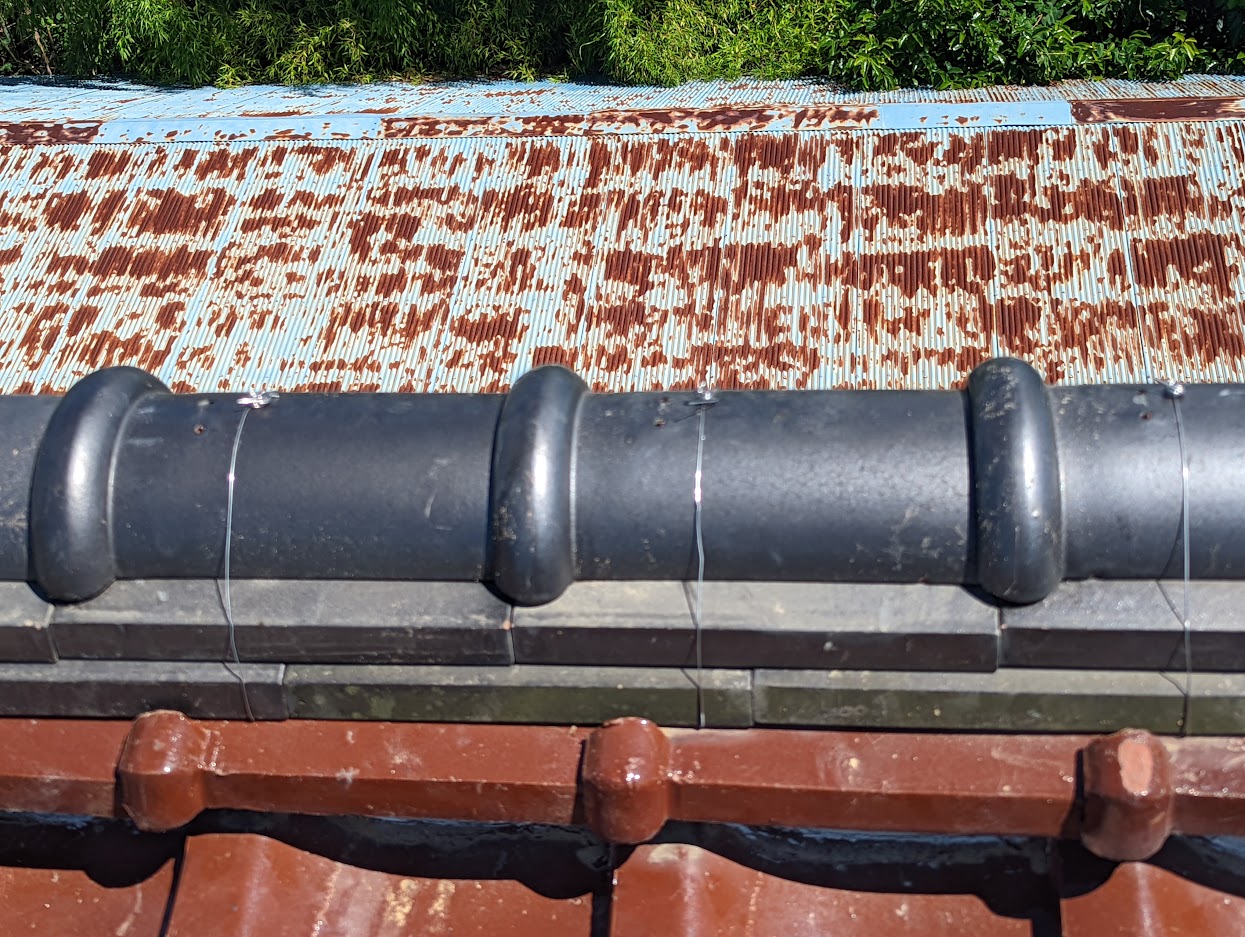 本年より建築基準において瓦葺き屋根は全ての瓦を屋根と金物で緊結することが義務付けられました。今回の地震被害でも古い建物が多く被害を受けていますが、緊結することが難しいケースが多く存在します。古い建物の場合だと屋根事態が歪んでいますので全てを固定しようとすると開きが出来てしまいます。今回の場合は銅締めという工法ですがステンレス線で瓦をしめます。歪んだ屋根に合わせて正確に加工して、適切に積み直すことが出来る職人がいれば日本瓦は本当に半永久的な屋根材だと思います。この工法での施工も当社で多く行っていますが昨年と本年の地震での再被害は出ておりません。