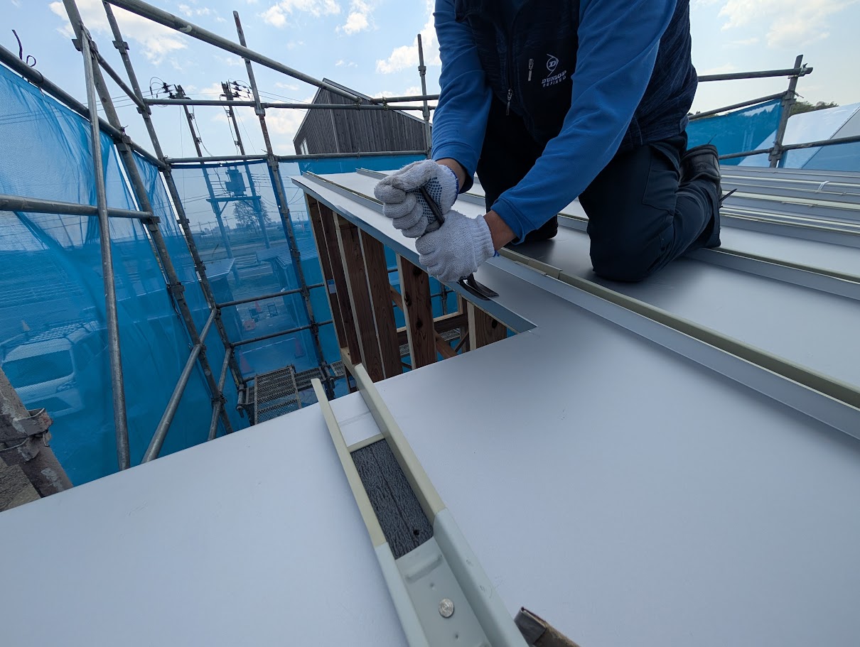 足場をかけて、屋根を葺いたり、外壁を張ったり地道に外部を進めています。