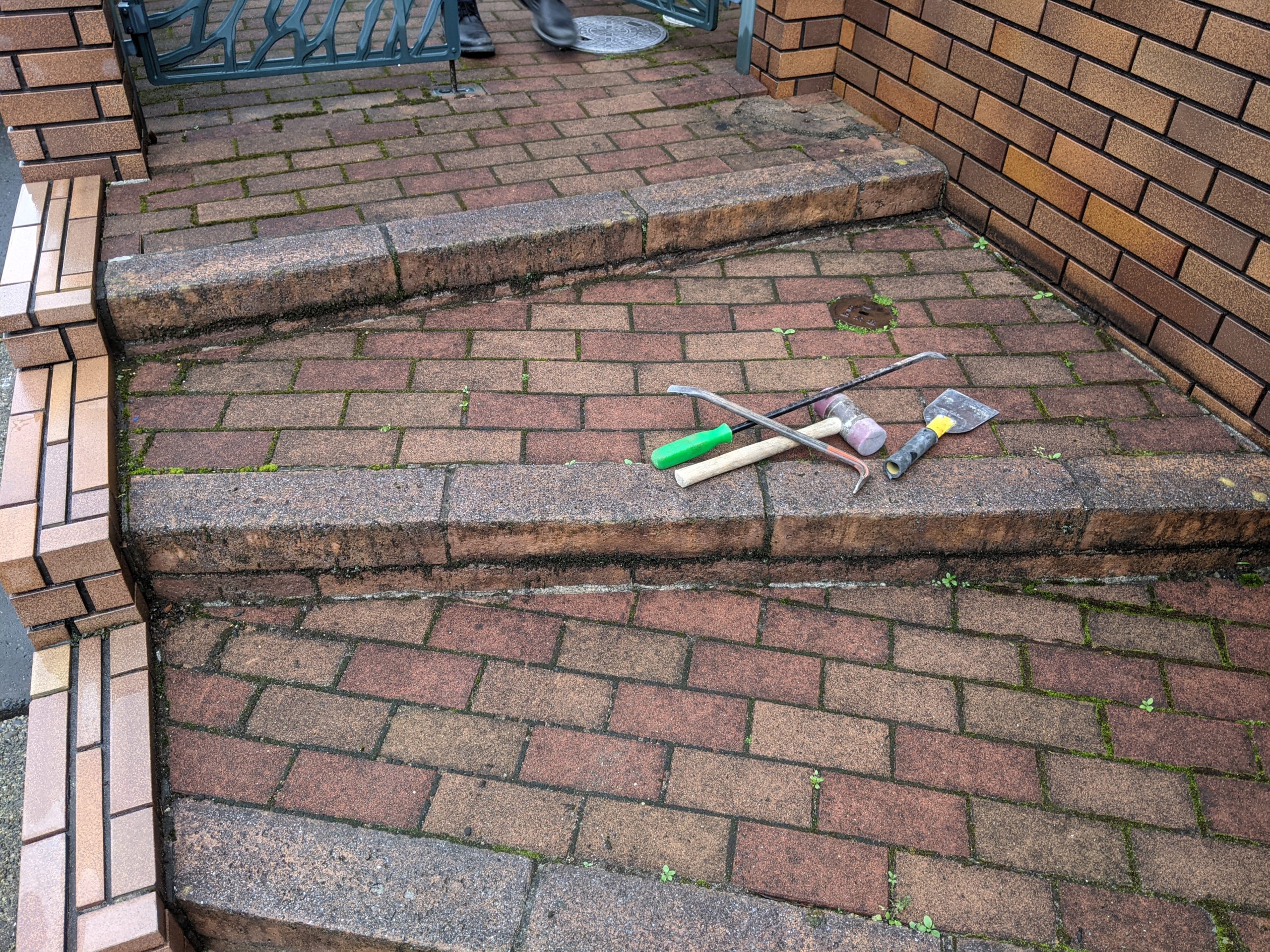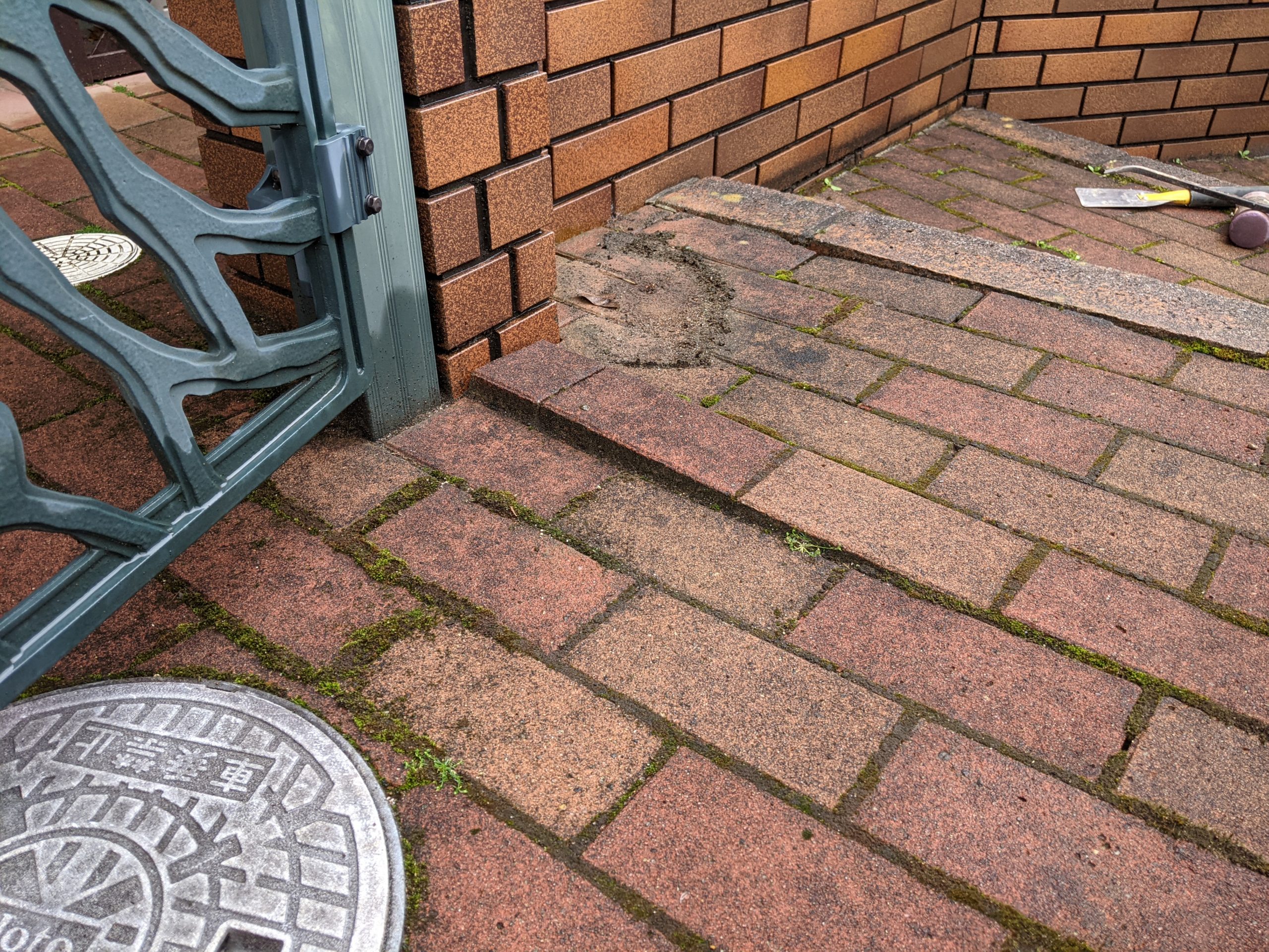 歪んできた玄関アプローチのインターロッキングを敷きなおしました