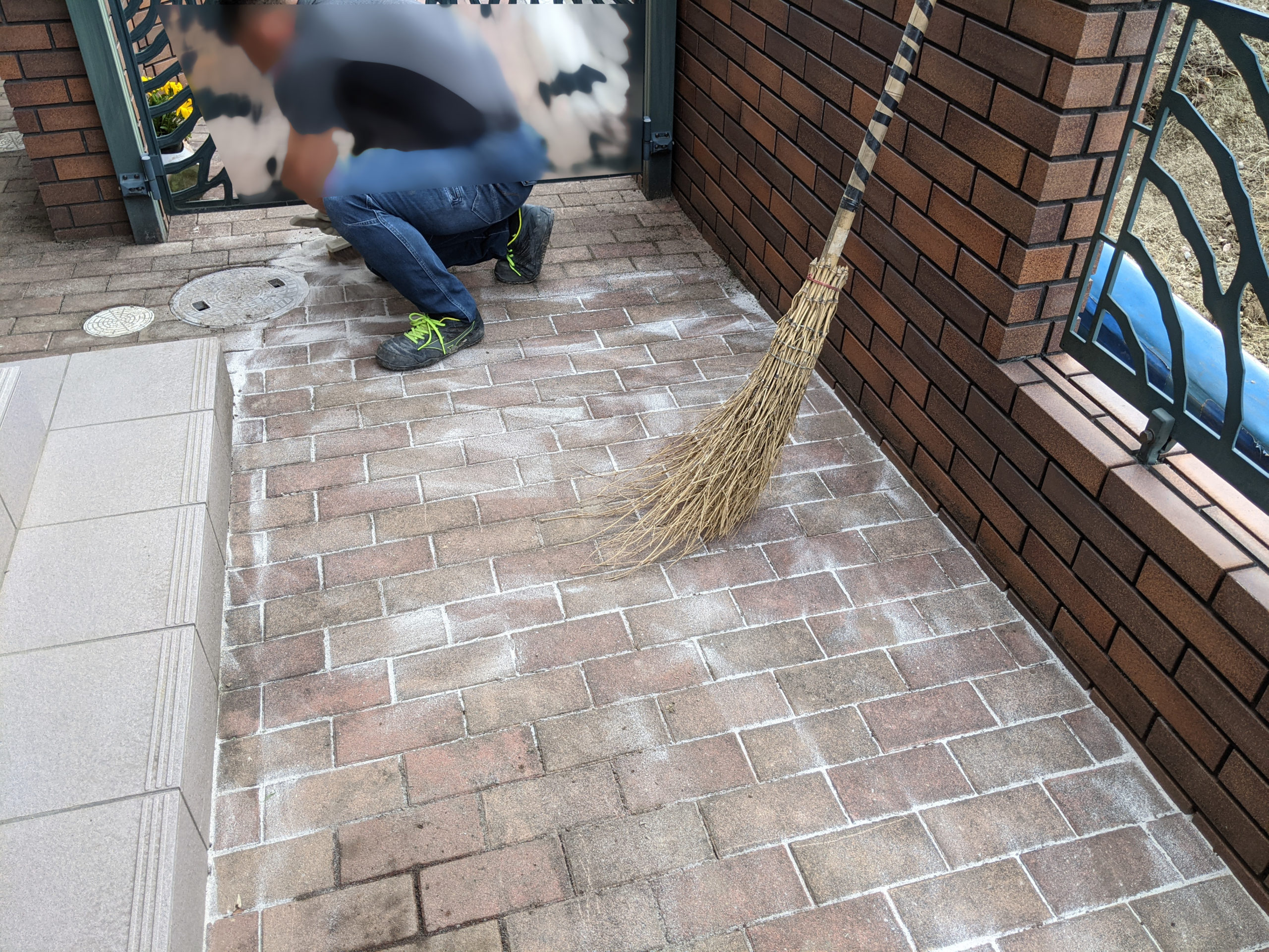 外したインターロッキングを再度敷き詰め、最後に目地へ珪砂を詰めて完了です。