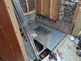 解体して、給排水の位置を設定、ユニットバスを組み立てて5日でお風呂にはいれるように段取り通りに進めます。
