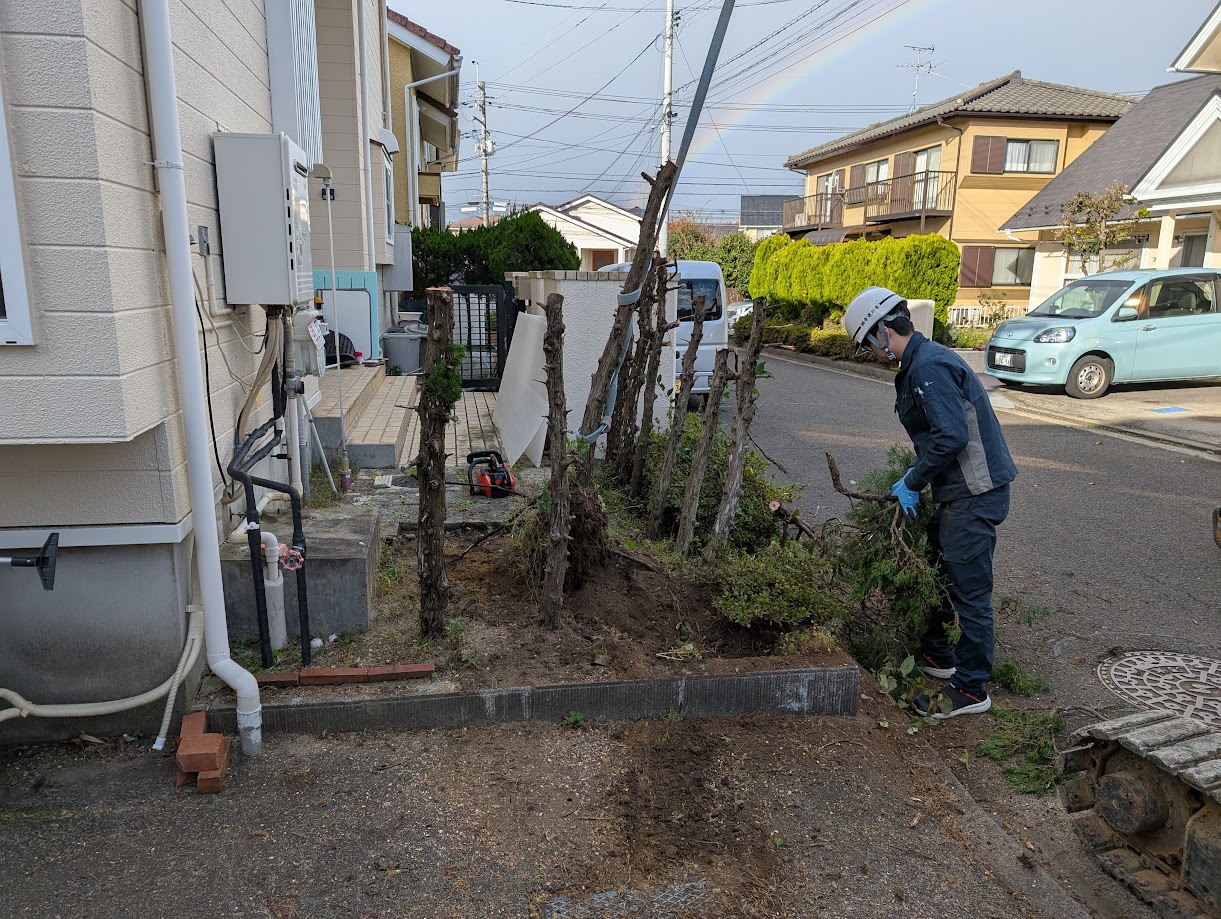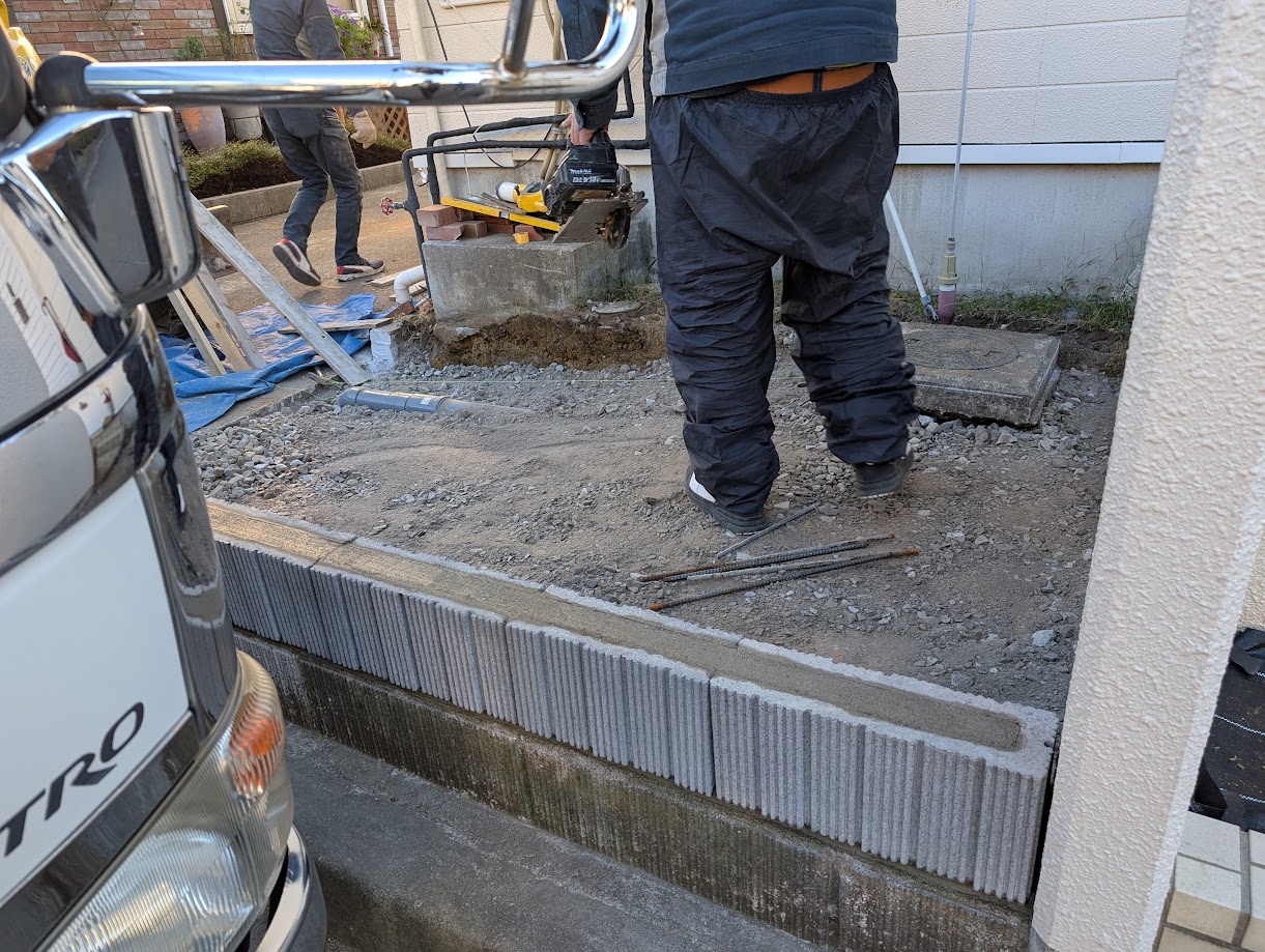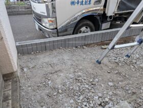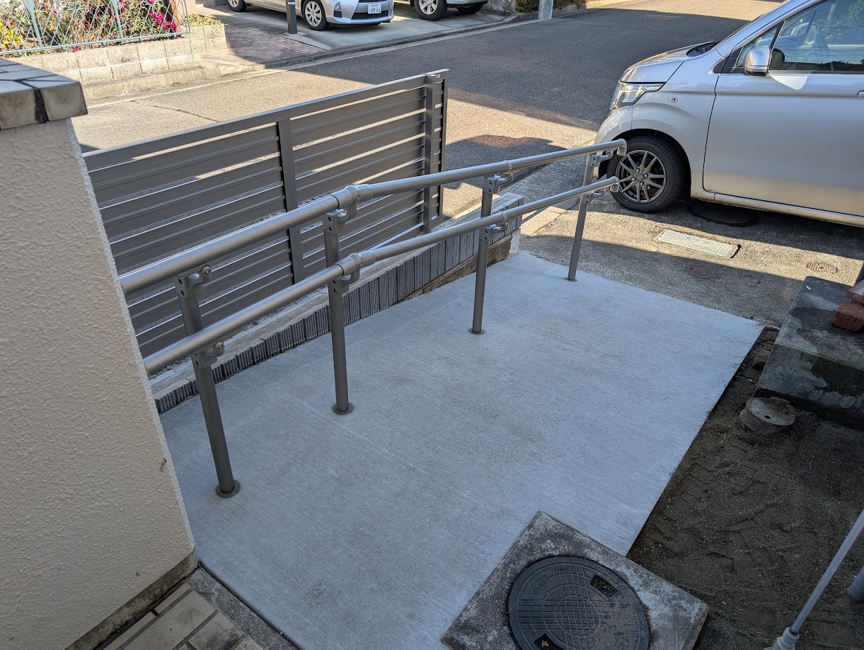 玄関わきから駐車場にスロープでつなげるために植栽を撤去しています。浴室の解体工事と抱き合わせにして費用を調整しました。