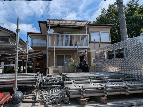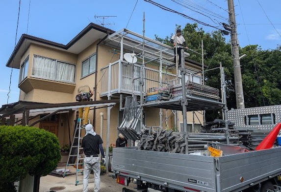 一番最後の屋根材を納めるにはベランダの外側から固定するので、こんなにちょっとしたことでも足場が必要になるんです。