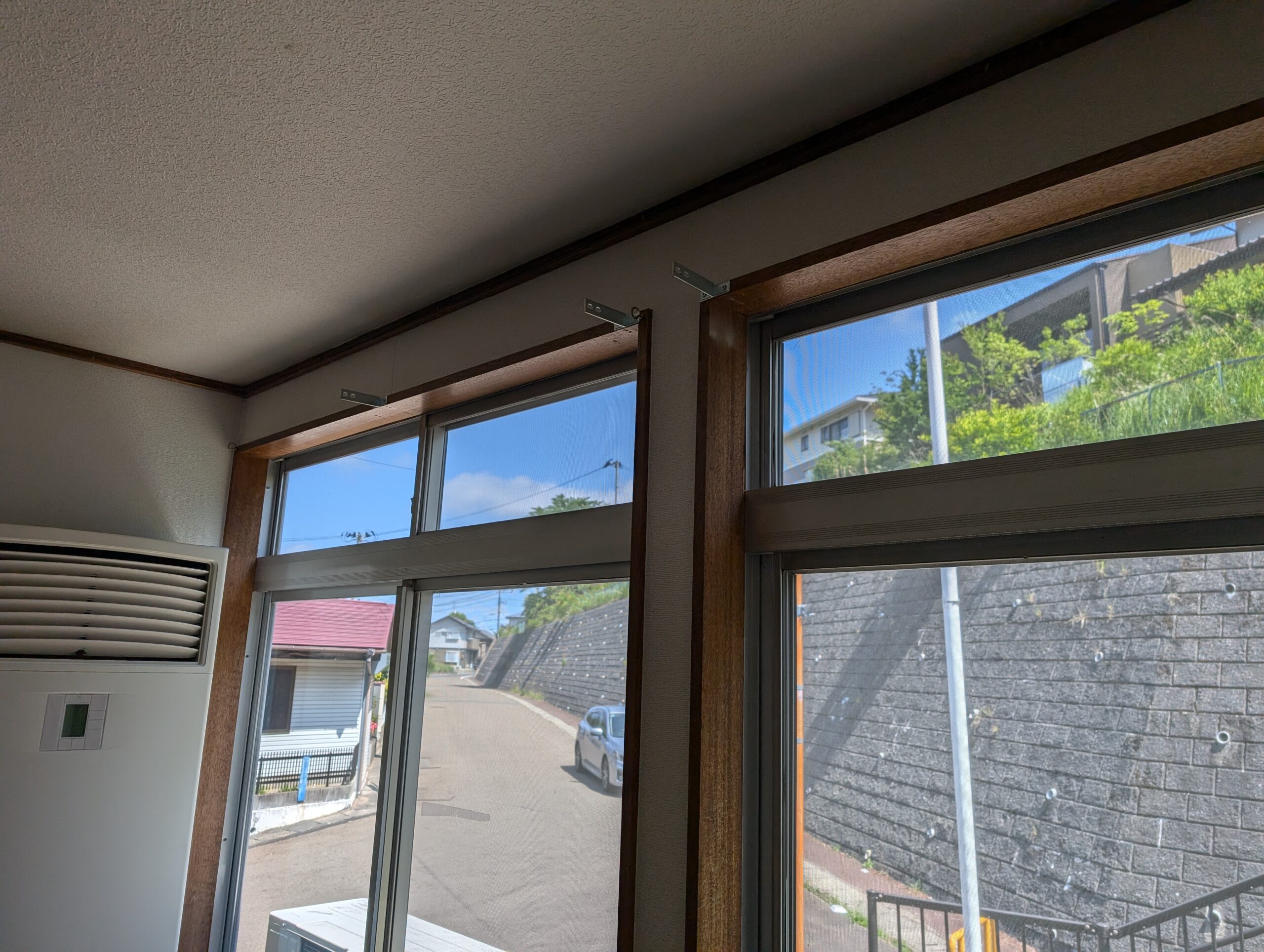 翁掃き出し窓は風の影響を受けないように、天井付けから正面付けに変更して、ブラインドをたたむと窓開口部外に収まるようにしています。