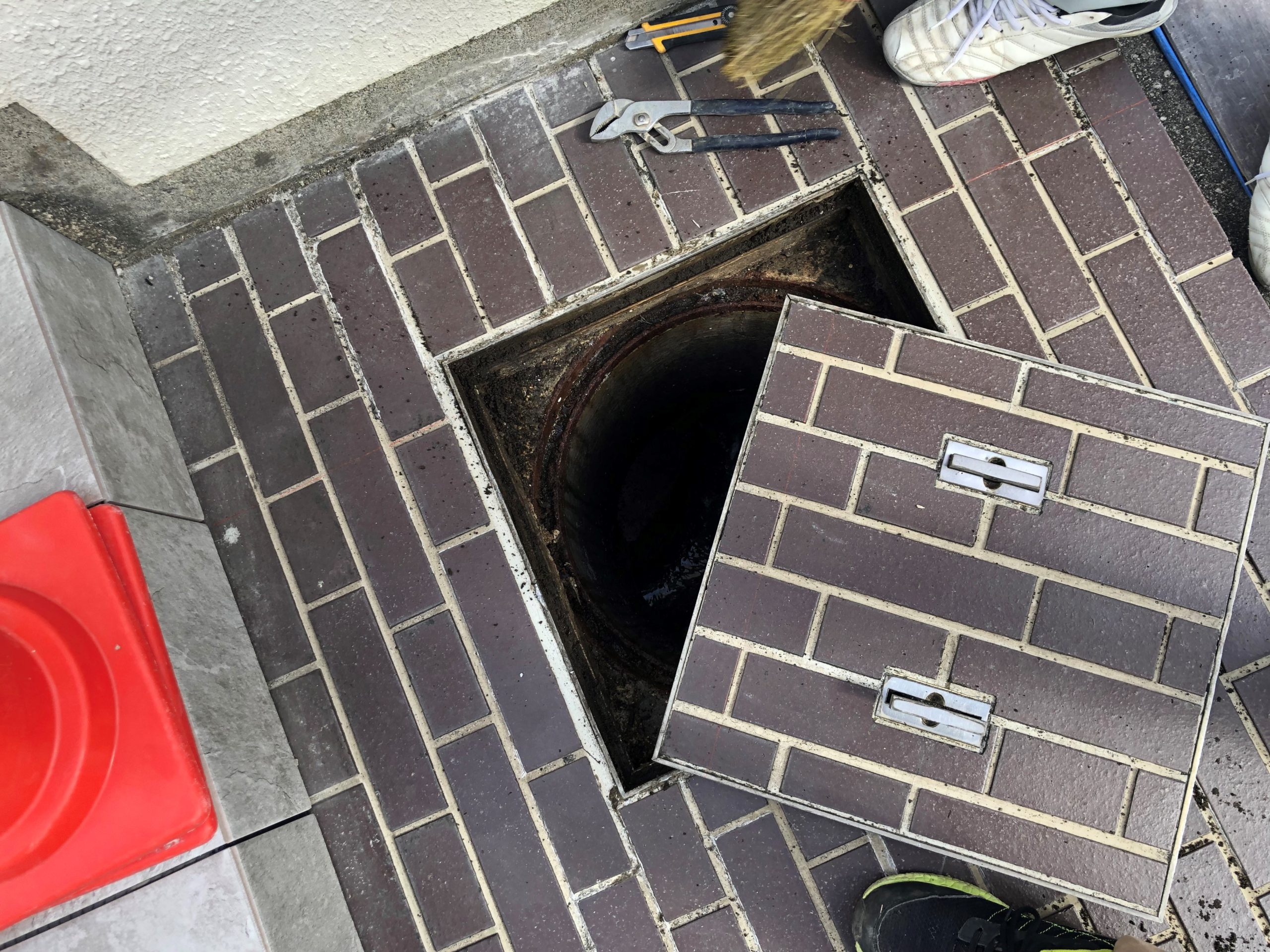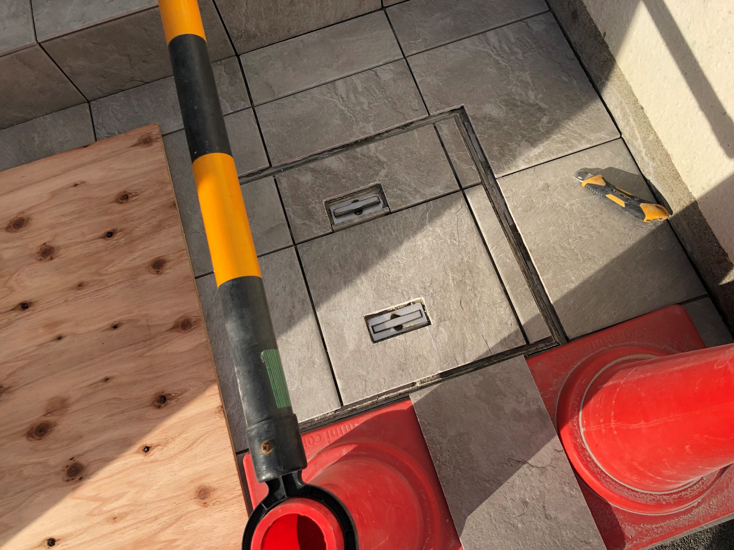 階段上部のアプローチは角周辺だけが弱っていましたので、近似のタイルを施工します。本枡の蓋はタイル目地の通りを調整しながら加工します。