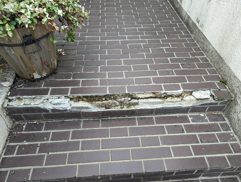 よく見かける階段の角の崩れ。経年劣化や雪かき、融雪剤色々原因はあります。
