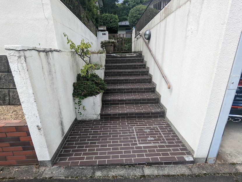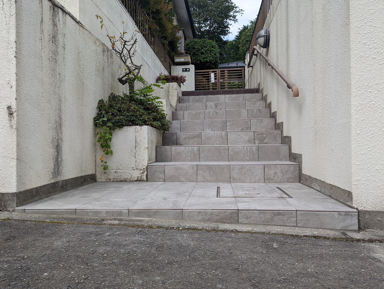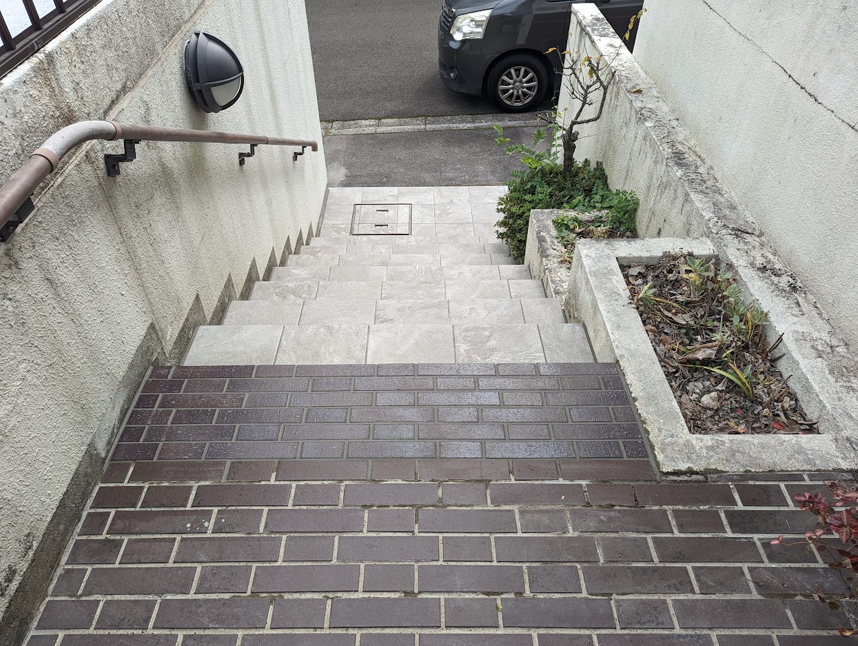階段はタイルの種類を変えて印象を変えました。上部アプローチは既存に似たタイルで変化を目立たなくしています。今後アプローチもリフォームすることを見越しての提案をさせていただきました。