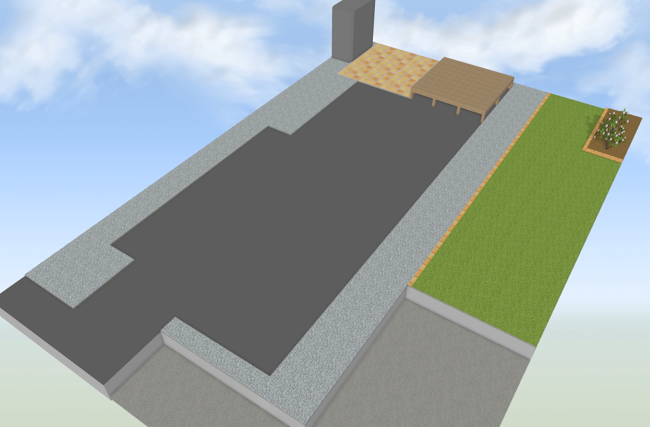施工前の状況では施工後のイメージができませんのでパースを作ってお施主さんと打ち合わせを繰り返して施工後のイメージを共有します。ご自宅廻は雨水管が地中を通っているので防草シートと化粧砂利を敷きました。お庭には防草シートと人工芝(リアリーターフ)を敷きます。レンガで見切りを作って砂利が人工芝にこぼれないようにします。角に小さい花壇を作ってお母さんからのご要望で一株だけ植え替えました。キウイも創作パーゴラに吊るし換え遊べるお庭になりました。