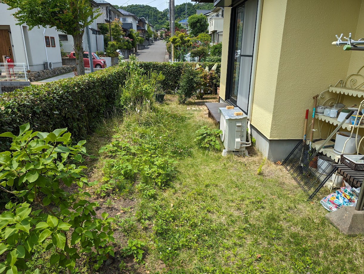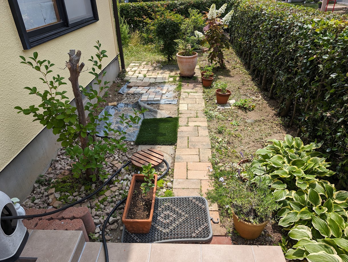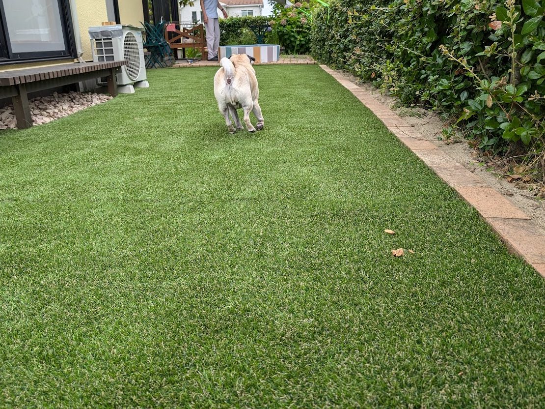 お庭に人工芝を敷いて遊べるようにしたいとのご相談です。玄関からお庭に続くアプローチとお庭に人工芝を敷きます。