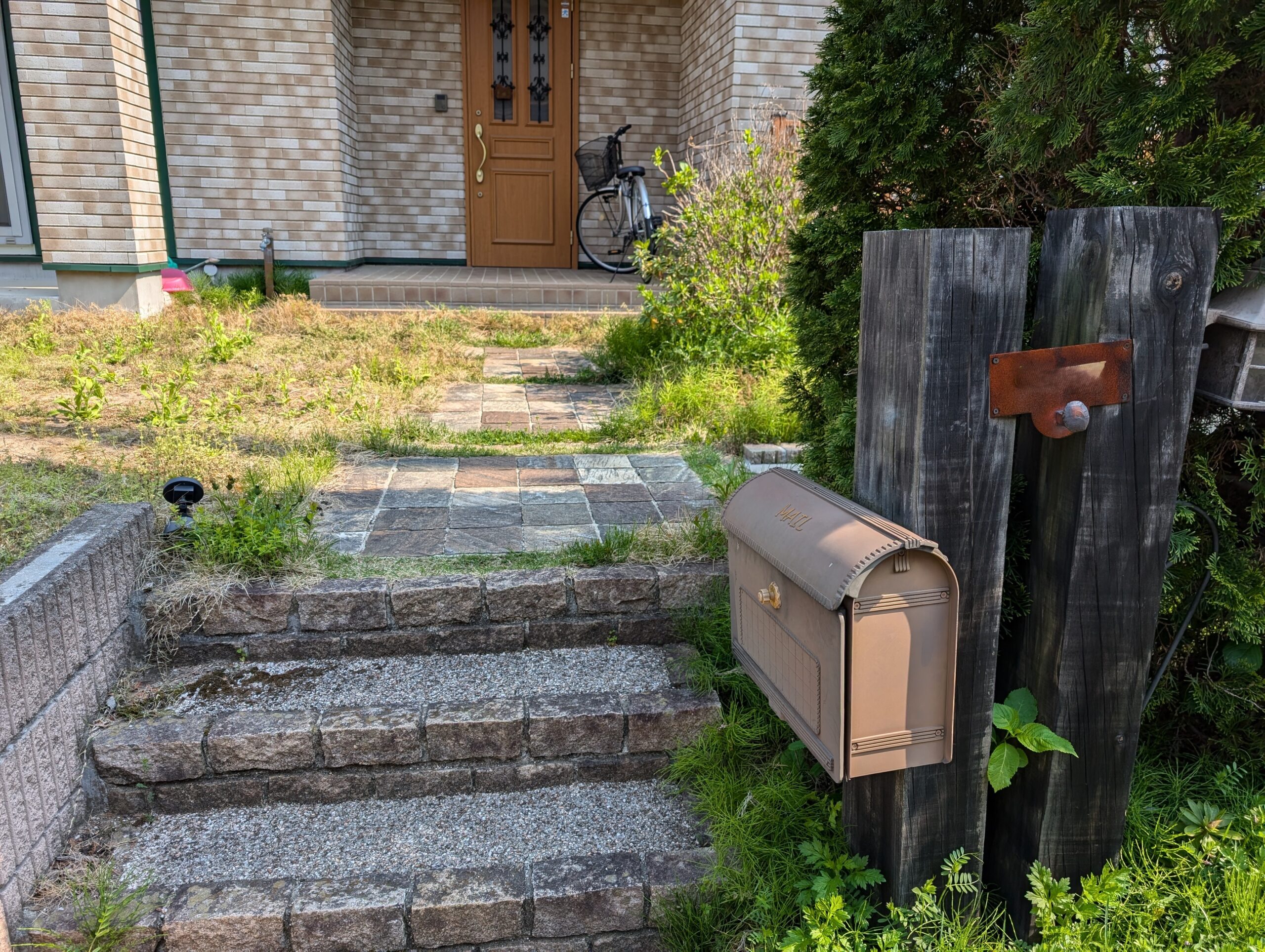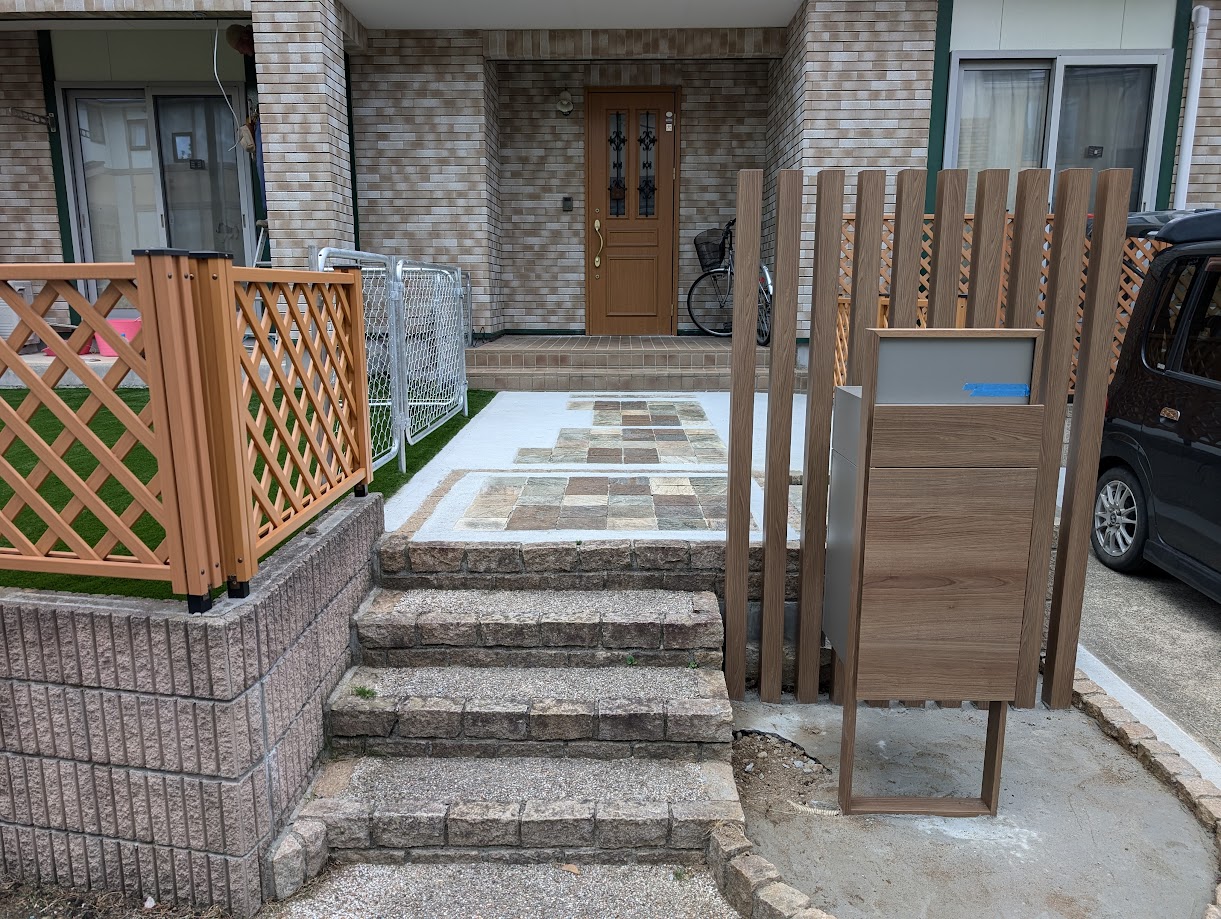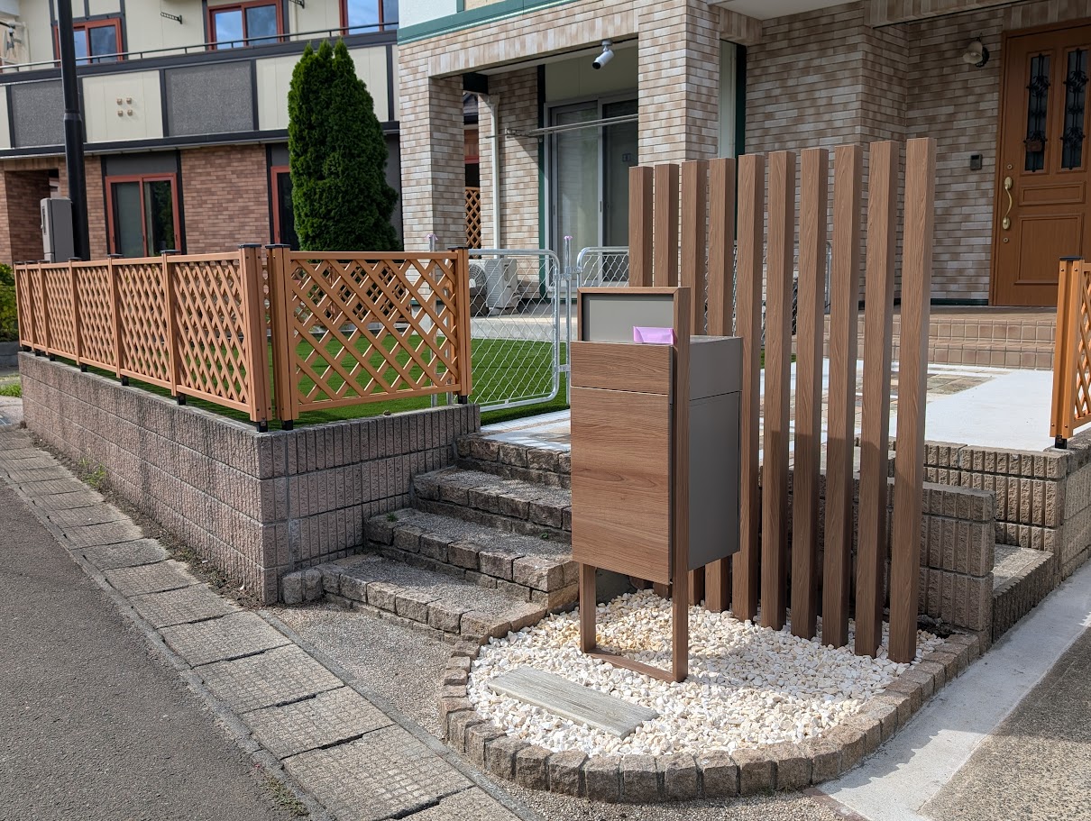 ご要望を詳しくお聞きし飼っているワンちゃんのために人工芝を敷いて、フェンスを設置し、大きくなったシンボルツリーを伐採し、駐車場の造成、ポスト設置し、砂利敷きと大きくリフォームしていきます。
