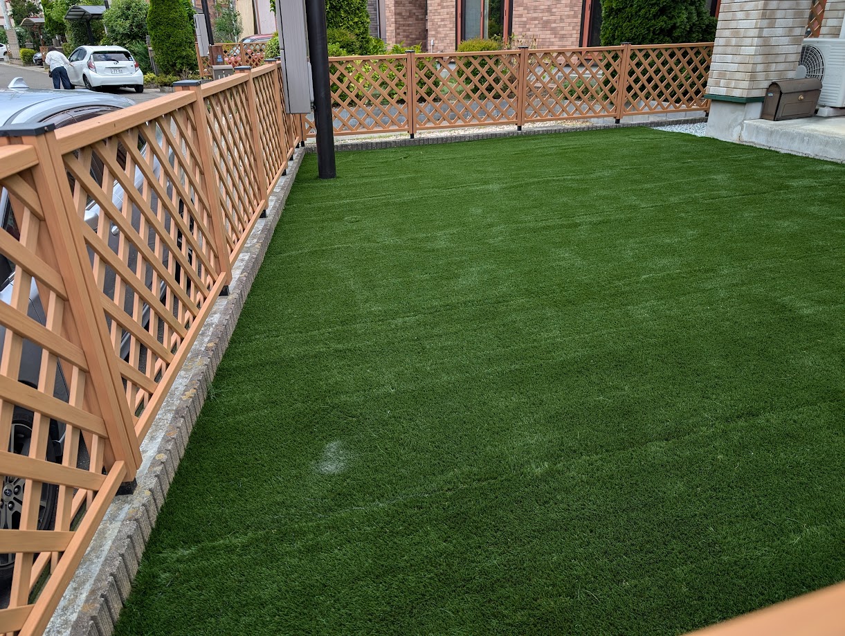 - 工事名人工芝敷き込み工事、フェンス設置、駐車スペース造成、伐採