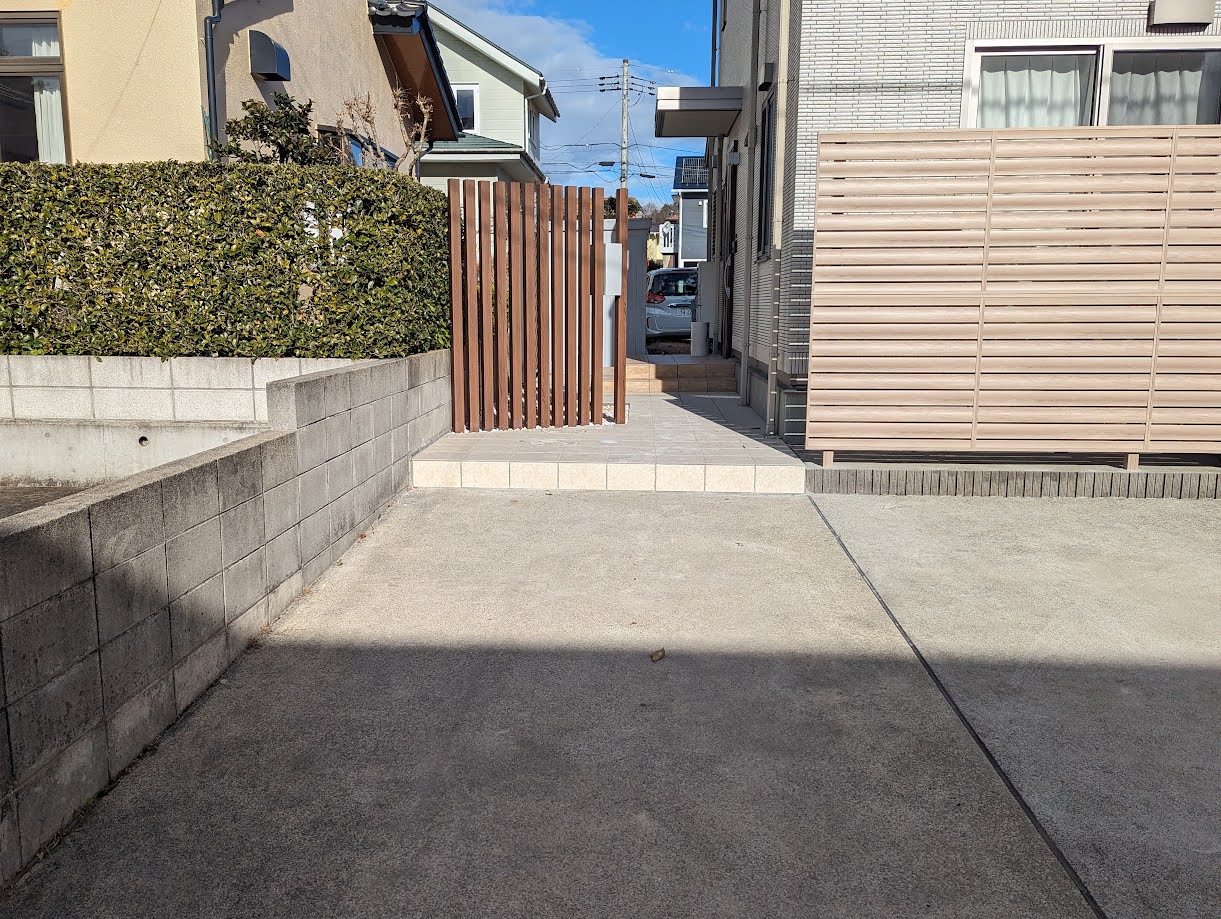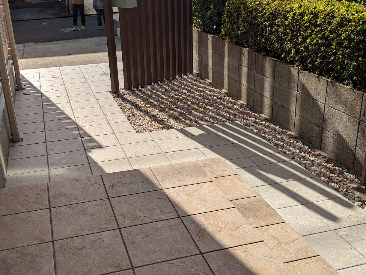 アプローチのはタイルと白い化粧舎利、アルミの木彫枕木で格子作って目隠し。雑草と人目を軽減します(*^-^*)