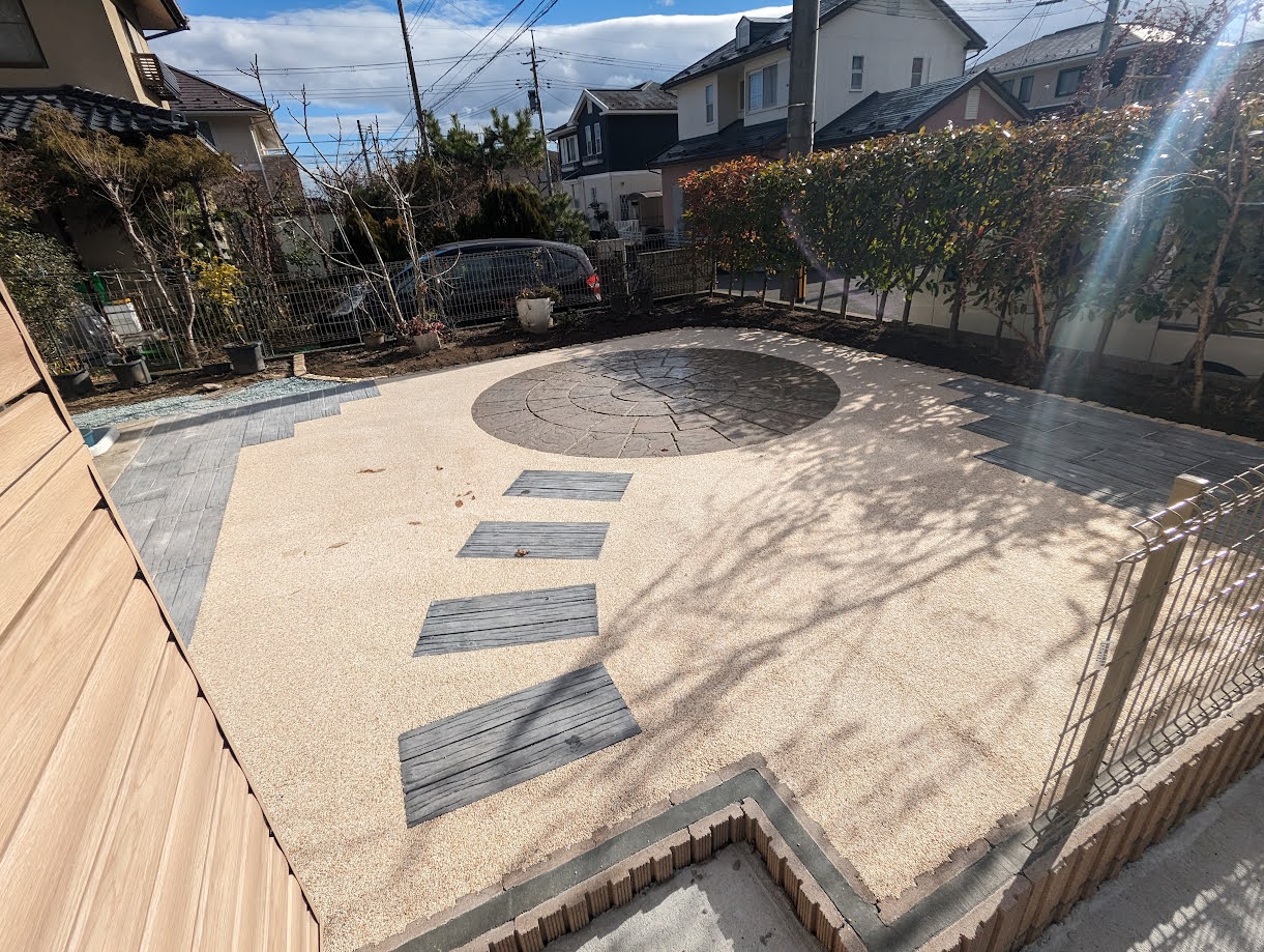 お庭はお施主様のお好みの配色で整えさせていただきました。地面の舗装もリンクストーンだとコンクリートよりも優しい感じに仕上がります😊