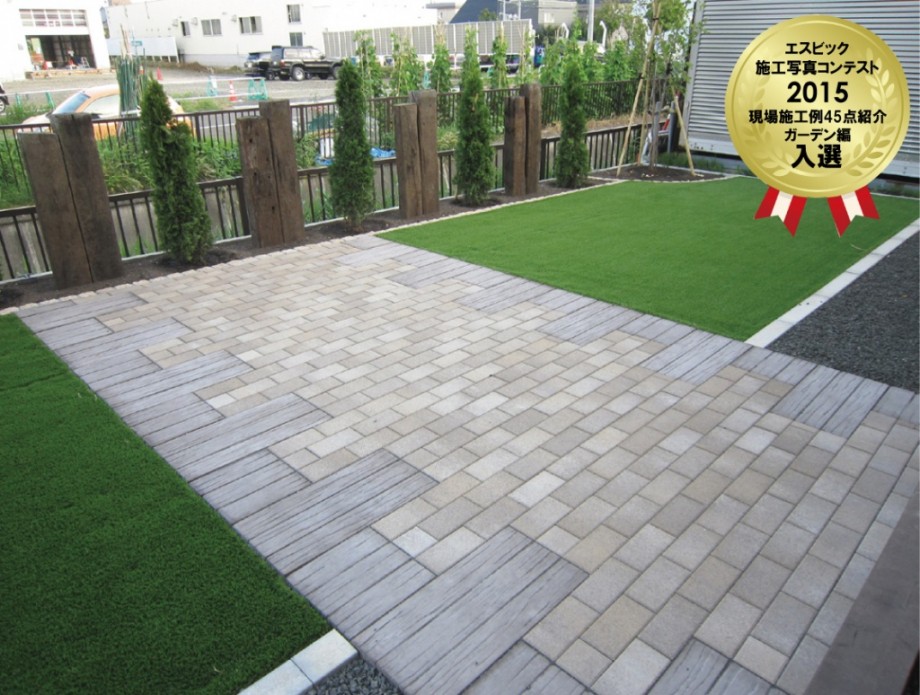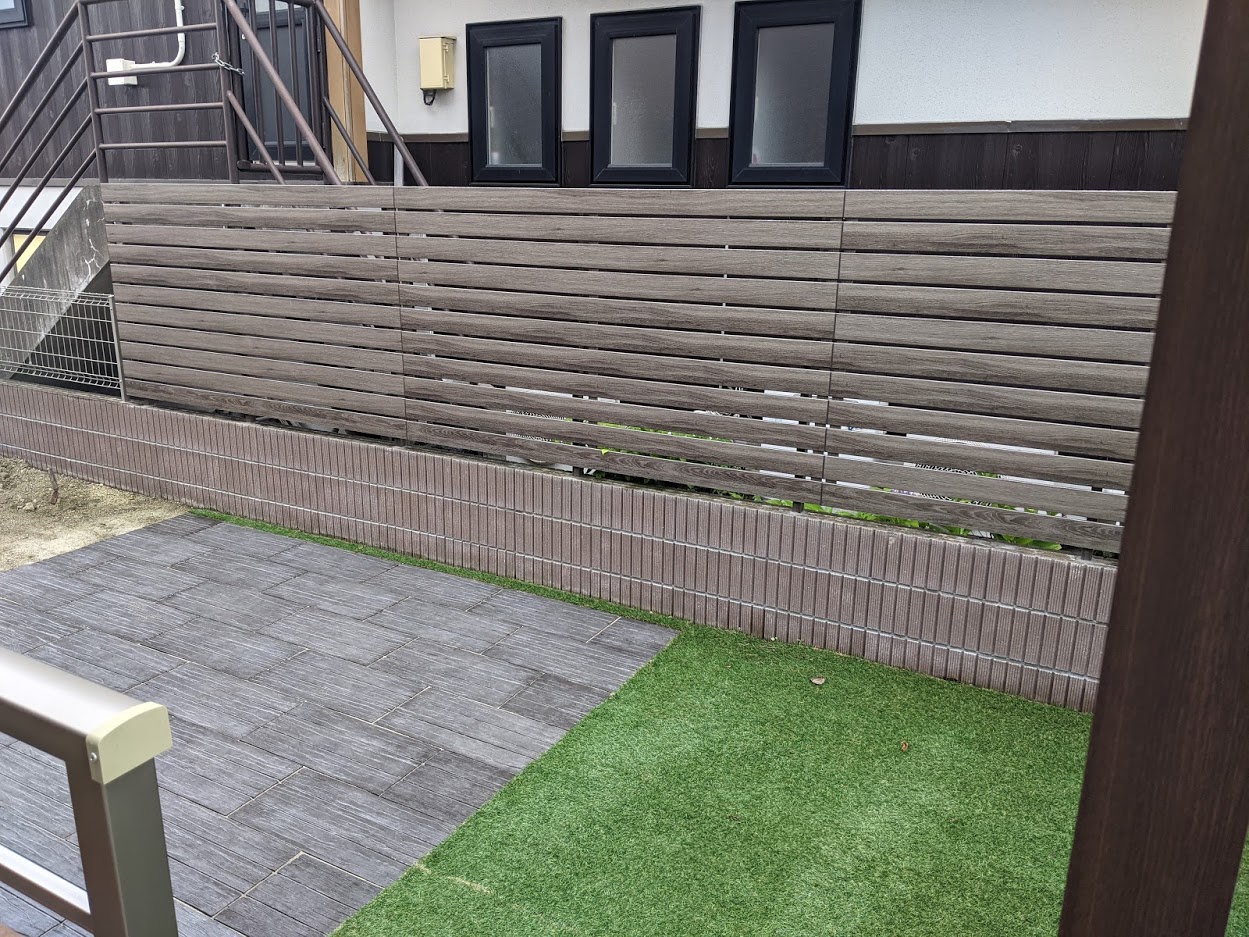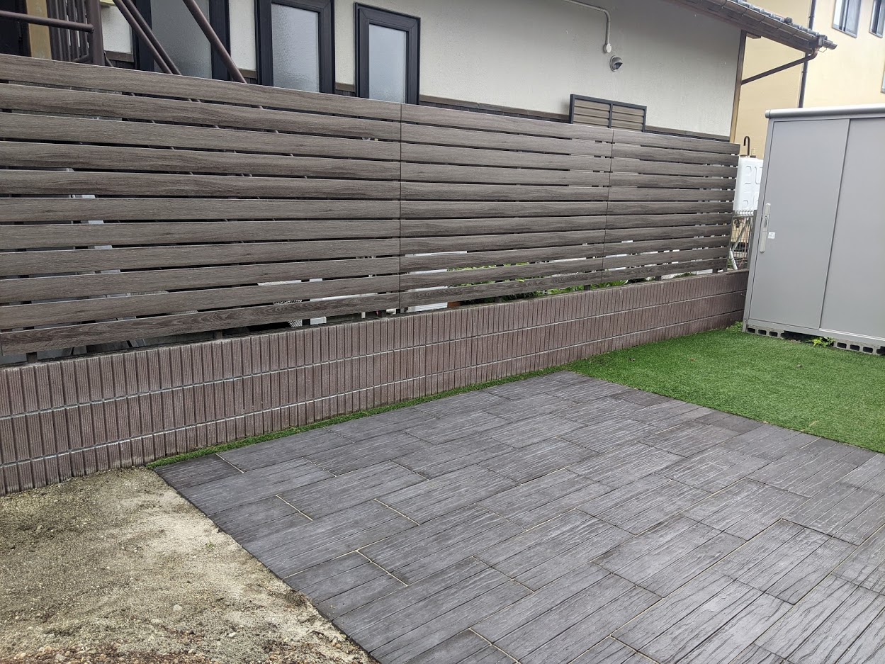 作成したプランのように目隠しフェンスを取り付けて、お庭のエリアを3つに分けました。フェンスは3枚に変更、デザインペイバーは千鳥張りですっきり四角形に配置。3枚目の写真奥から、人工芝(ウッドデッキアプローチ)、デザインペイバー(BBQスペース)、ガーデニングスペースはこれからお施主様がDIYを楽しんでいきます。