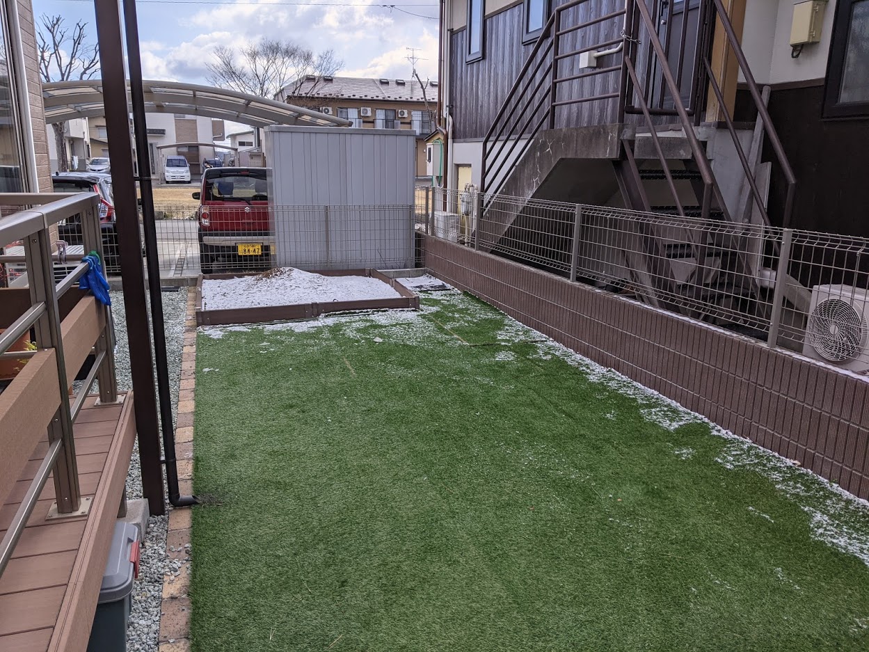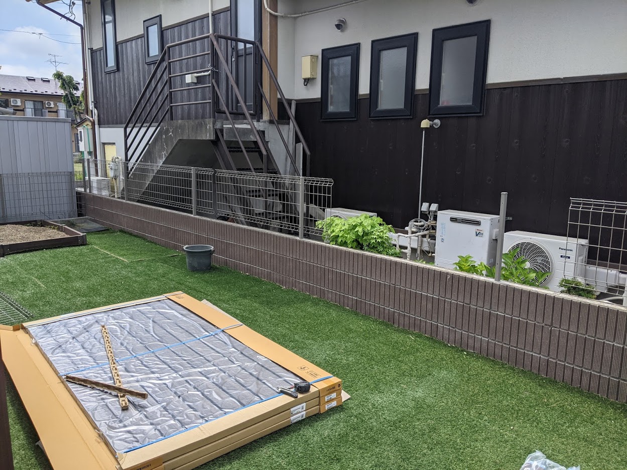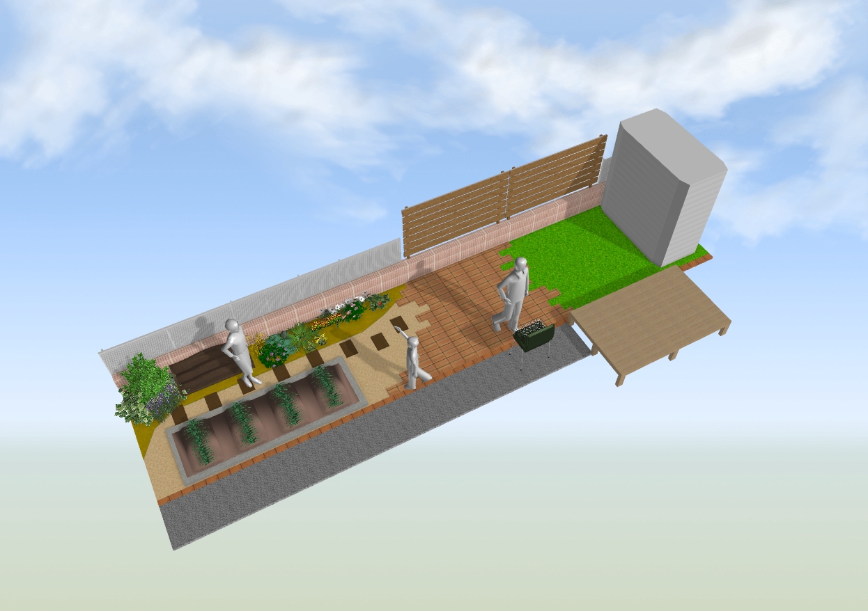 作成したプランのように目隠しフェンスを取り付けて、お庭のエリアを3つに分けました。フェンスは3枚に変更、デザインペイバーは千鳥張りですっきり四角形に配置。3枚目の写真奥から、人工芝(ウッドデッキアプローチ)、デザインペイバー(BBQスペース)、ガーデニングスペースはこれからお施主様がDIYを楽しんでいきます。