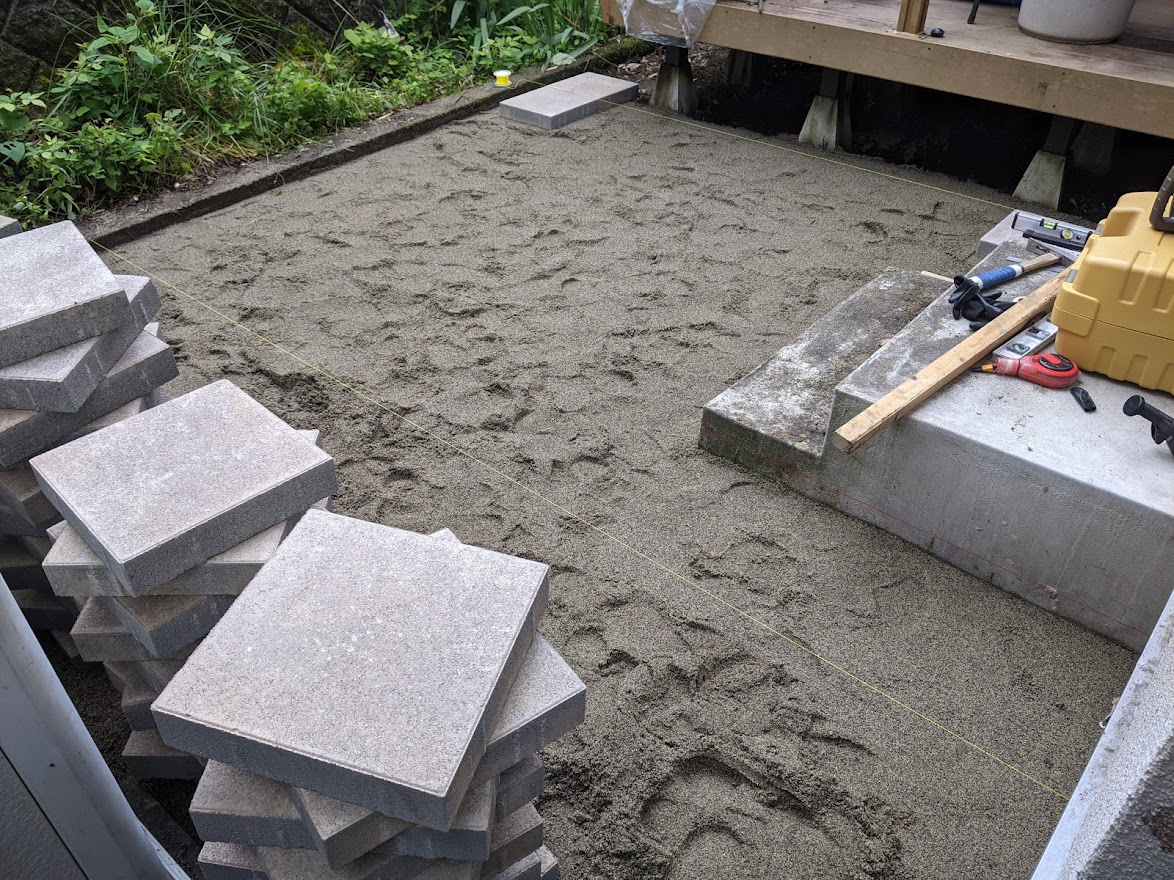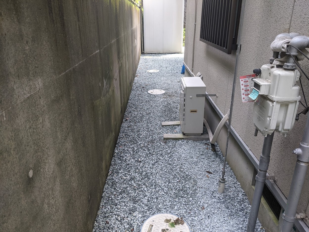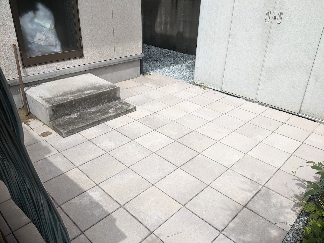ウッドデッキのあるお勝手口にはインタロッキングを敷きました。玄関に向かう通路にも防草シートと化粧砂利を敷きました。BBQをするときはウッドデッキが前よりも広く使えます。
