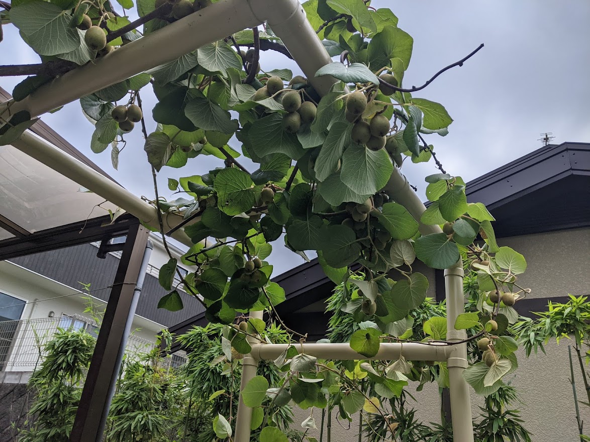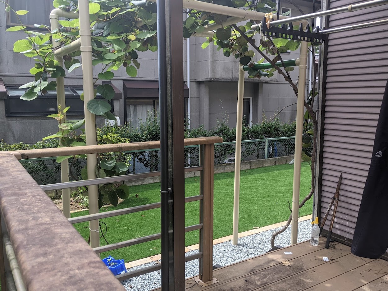 施工前の状況では施工後のイメージができませんのでパースを作ってお施主さんと打ち合わせを繰り返して施工後のイメージを共有します。ご自宅廻は雨水管が地中を通っているので防草シートと化粧砂利を敷きました。お庭には防草シートと人工芝(リアリーターフ)を敷きます。レンガで見切りを作って砂利が人工芝にこぼれないようにします。角に小さい花壇を作ってお母さんからのご要望で一株だけ植え替えました。キウイも創作パーゴラに吊るし換え遊べるお庭になりました。