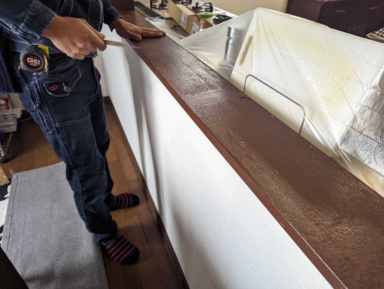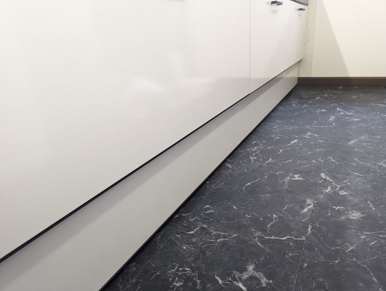 お客さんのご希望でキッチンの枠を大理石っぽくしたいということで、M3のダイノックシートを施工しました。キッチンの床が汚れやすいので掃除しやすくしたいというご希望もありクッションフロアーも部分的に施工しました。
