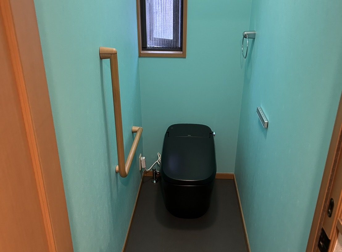 2階はスタイリッシュさがかっこいい黒のタンクレストイレに鮮やかなブルーのクロスを選んでくださいました。