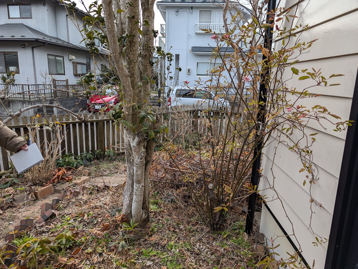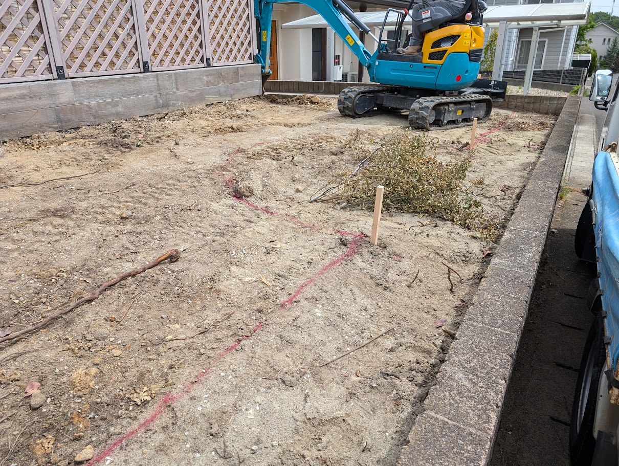 1部の樹木を残して、お手入れが難しい現在の樹木を伐採、抜根しお手入れが楽になるようコンクリート舗装をしていきます。