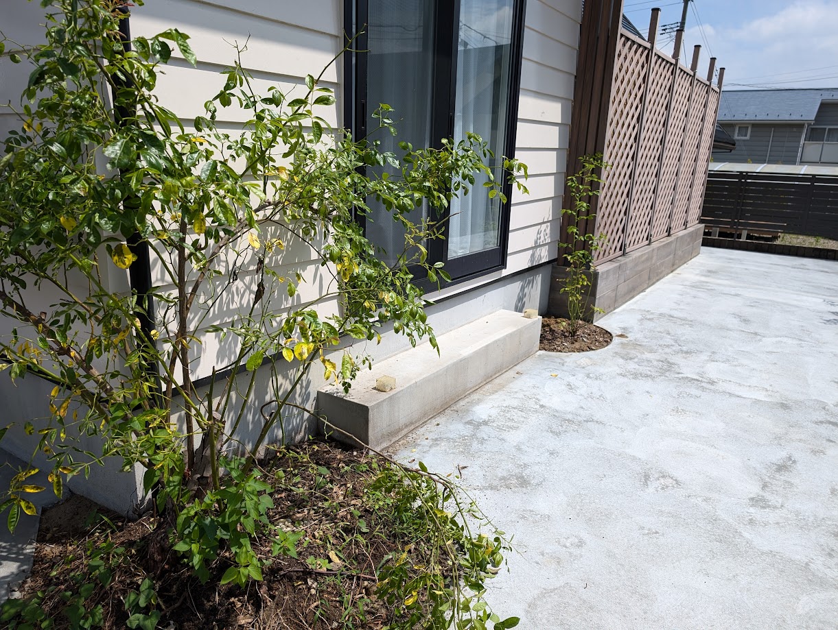 今回はお庭のコンクリート舗装、植樹、フェンス設置、浴室リフォーム、窓の修繕をしました。