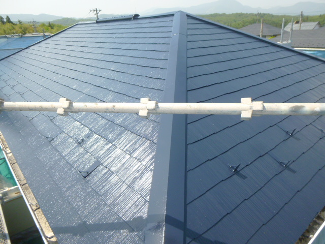 屋根の傷みは結構進んでいましたので シーラーを屋根材にしみこませて吸い込みを止めます。フィラーで増膜させて強化します。仕上げに撥水性を与えるためにシリコン塗料を2回塗布しました。塗装工事が完成すると建物が以前よりしっかりして見えるので安心できる印象が出てきます。ブルーを基調にした色使いはとてもそう快感があります。