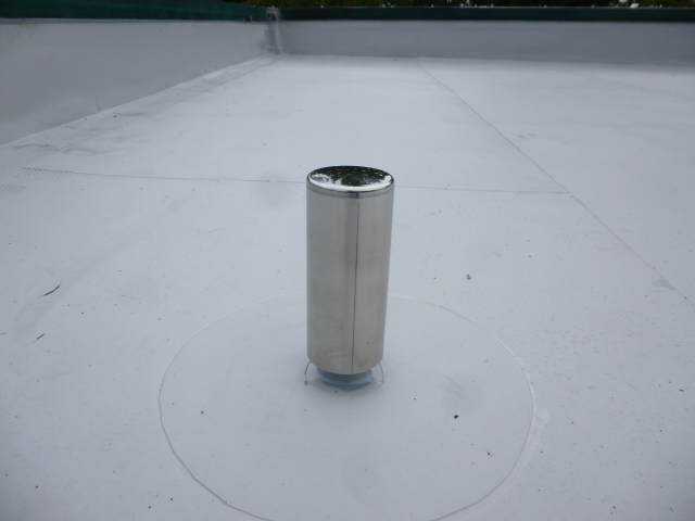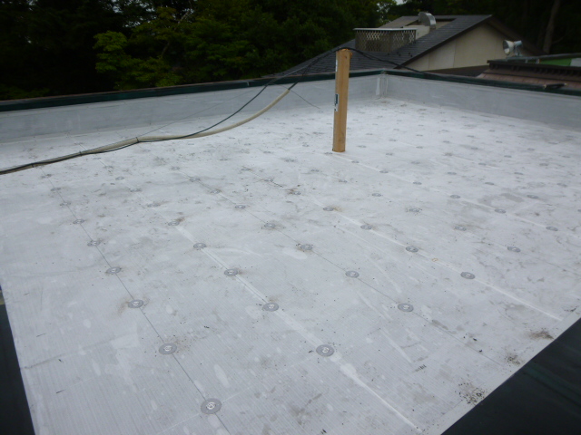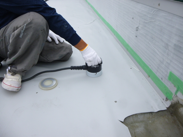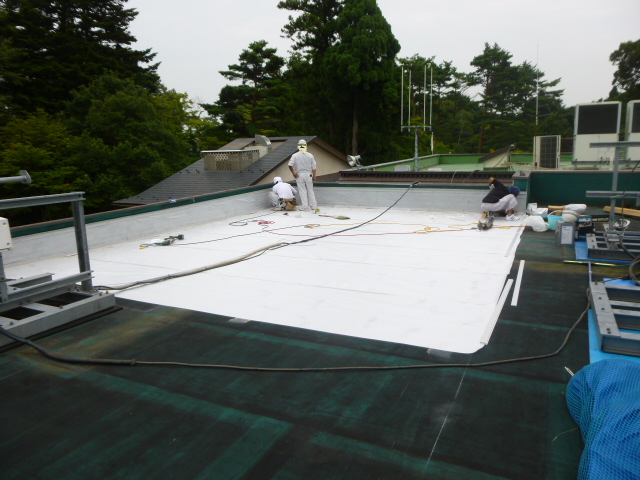 今回は既存の防水シートを撤去せずに重ね張りをするために 【塩ビシート防水 機械固定工法】を採用させていただきました。