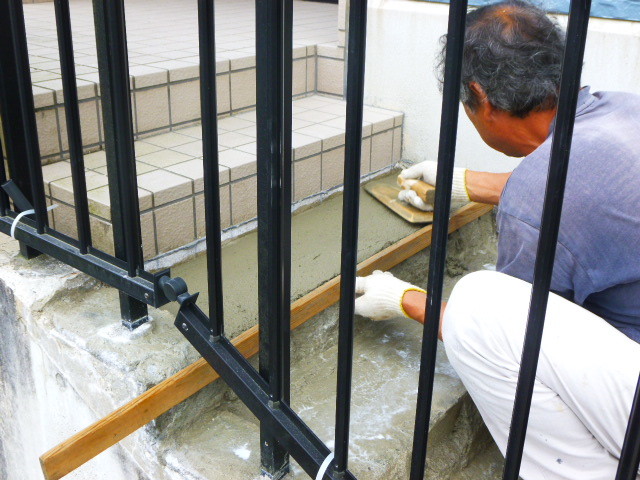 解体後、。モルタルをしっかり密着させるため、下地接着剤を全体に塗布します。下地接着剤が乾いたらモルタルで階段を丁寧に平行に形成していきます。