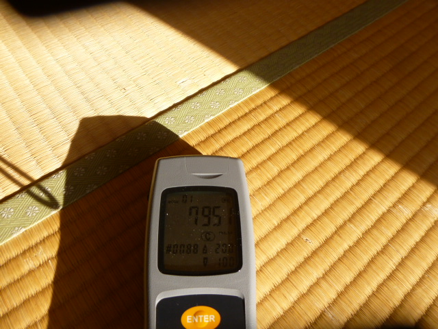 畳の時の数値は7951 施工後の数値は79 という結果になり効果がありそうですが、少し考えるところがあります。まだお金をかけてまでやるものでもなさそうな気がしますので今後はお勧めいたしません。