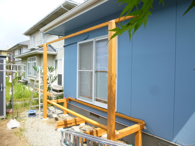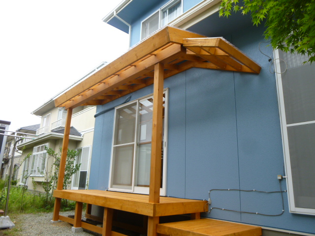 塗装工事と同時に造作させていただきました。木製の屋根付きデッキなので用途に応じた形を作ることができるます。