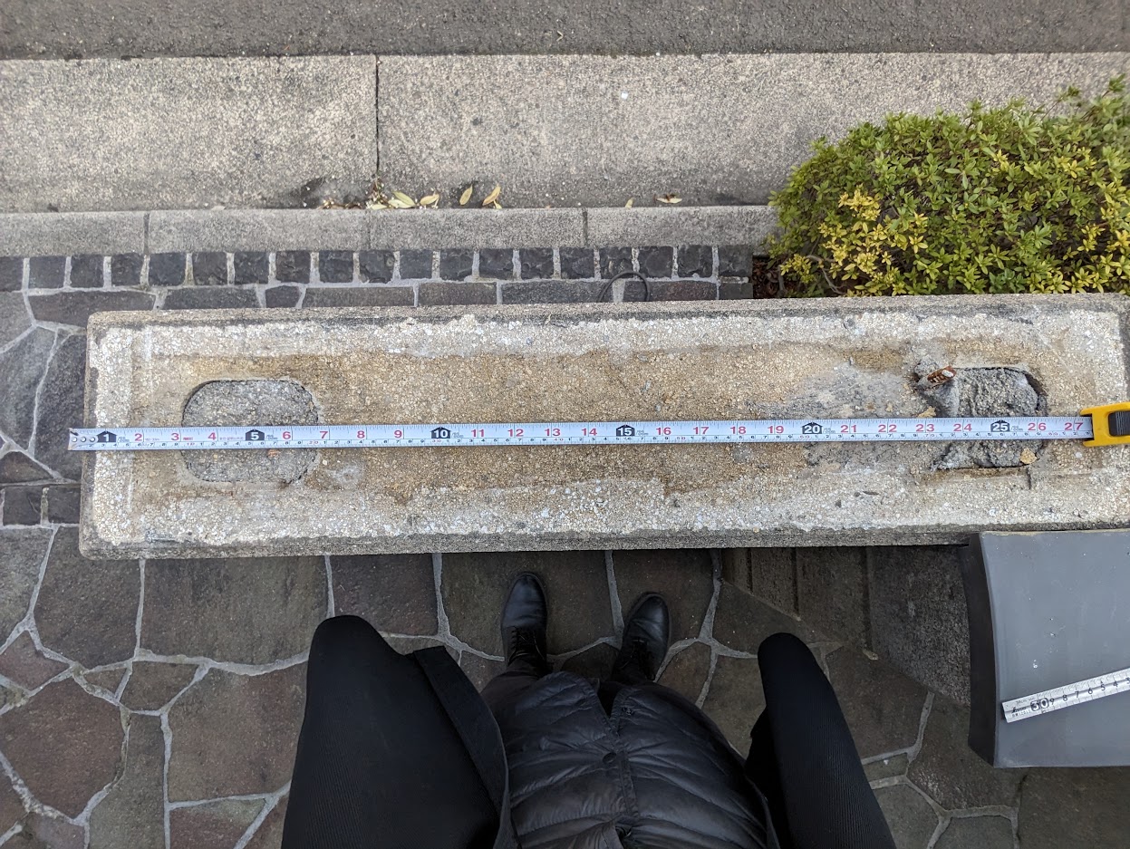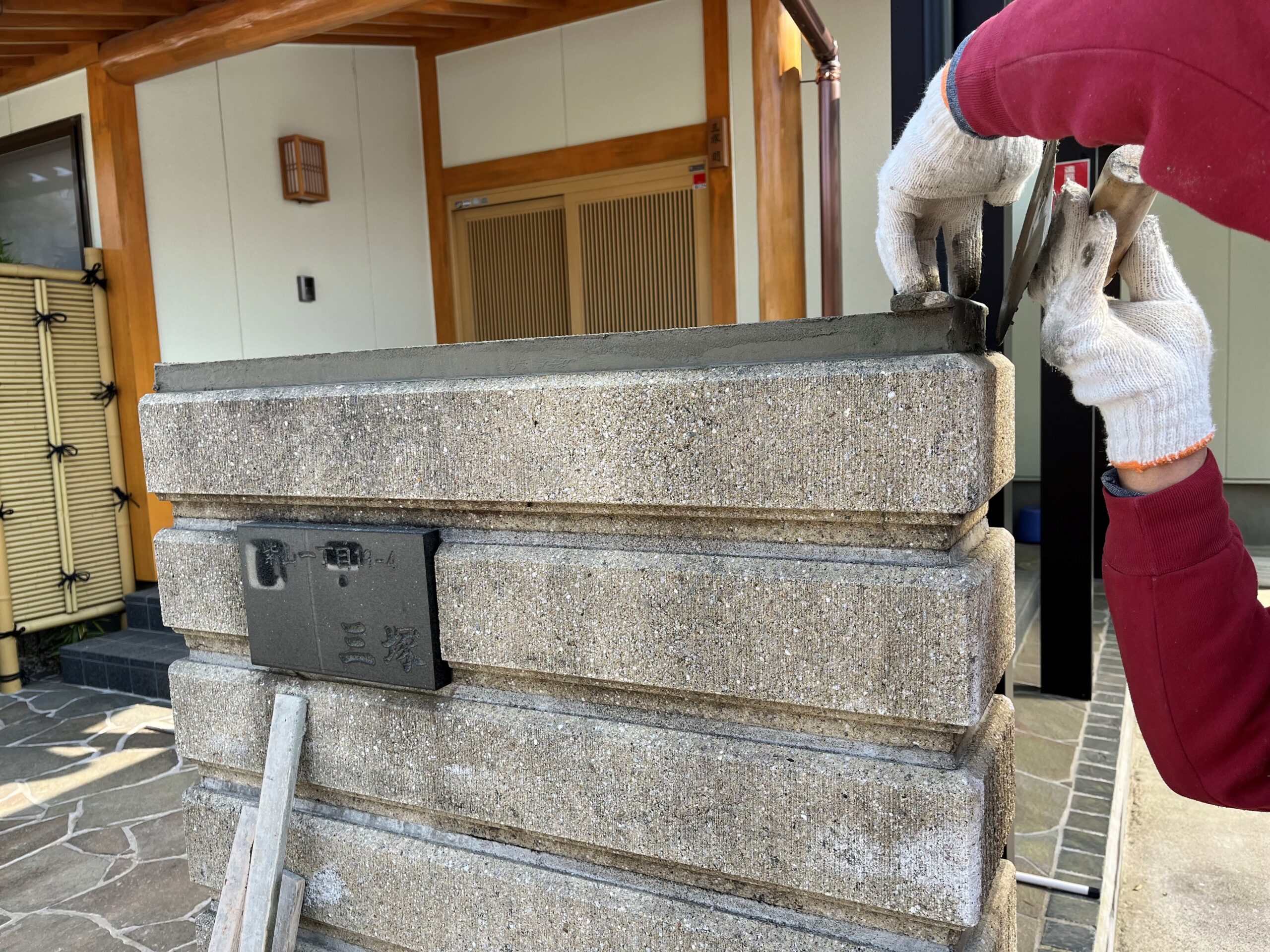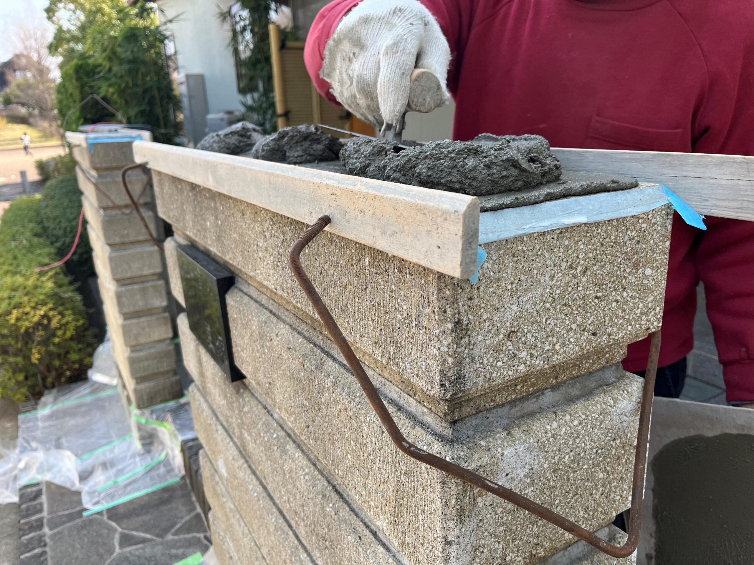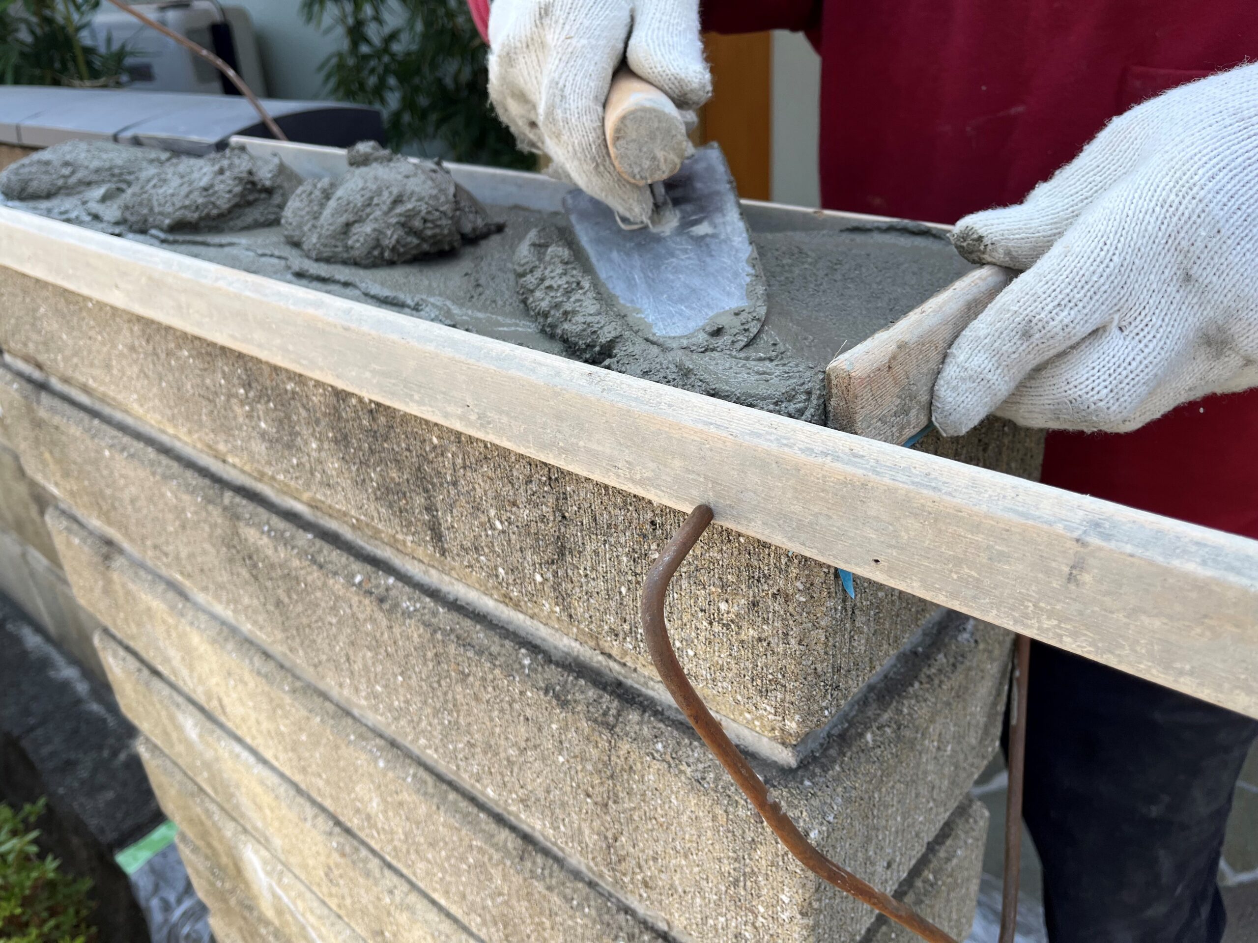 笠木ブロックを撤去して、モルタルで型を作って、鹿児島から桜島溶岩石を取り寄せて圧着!!