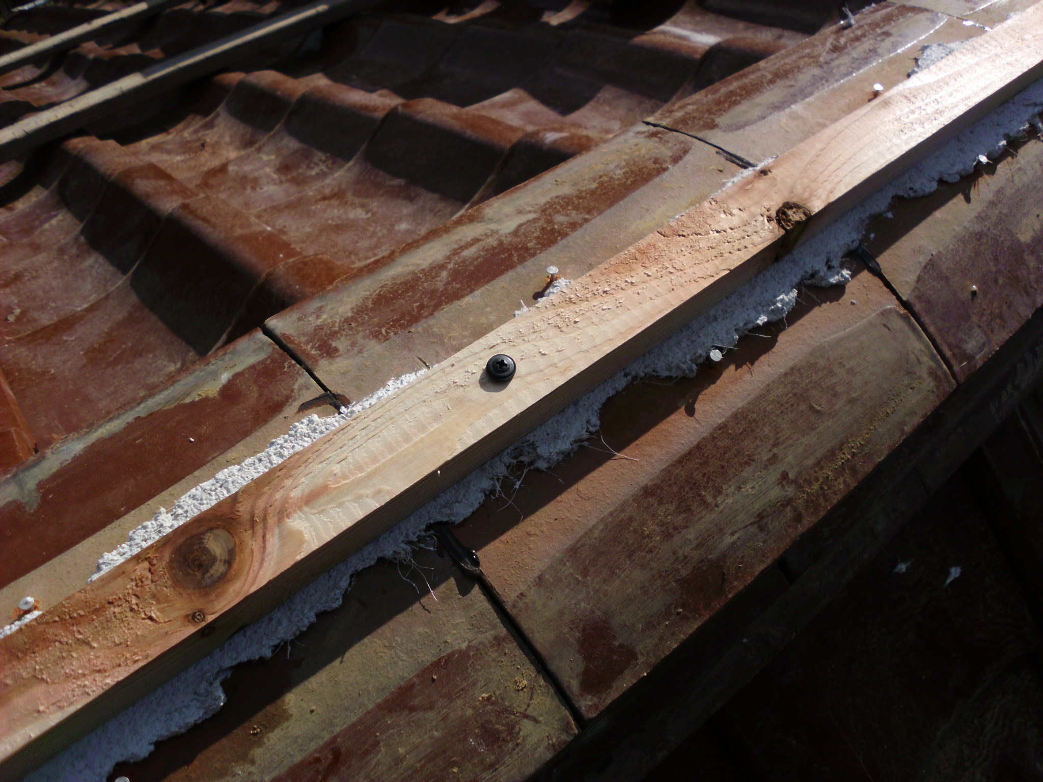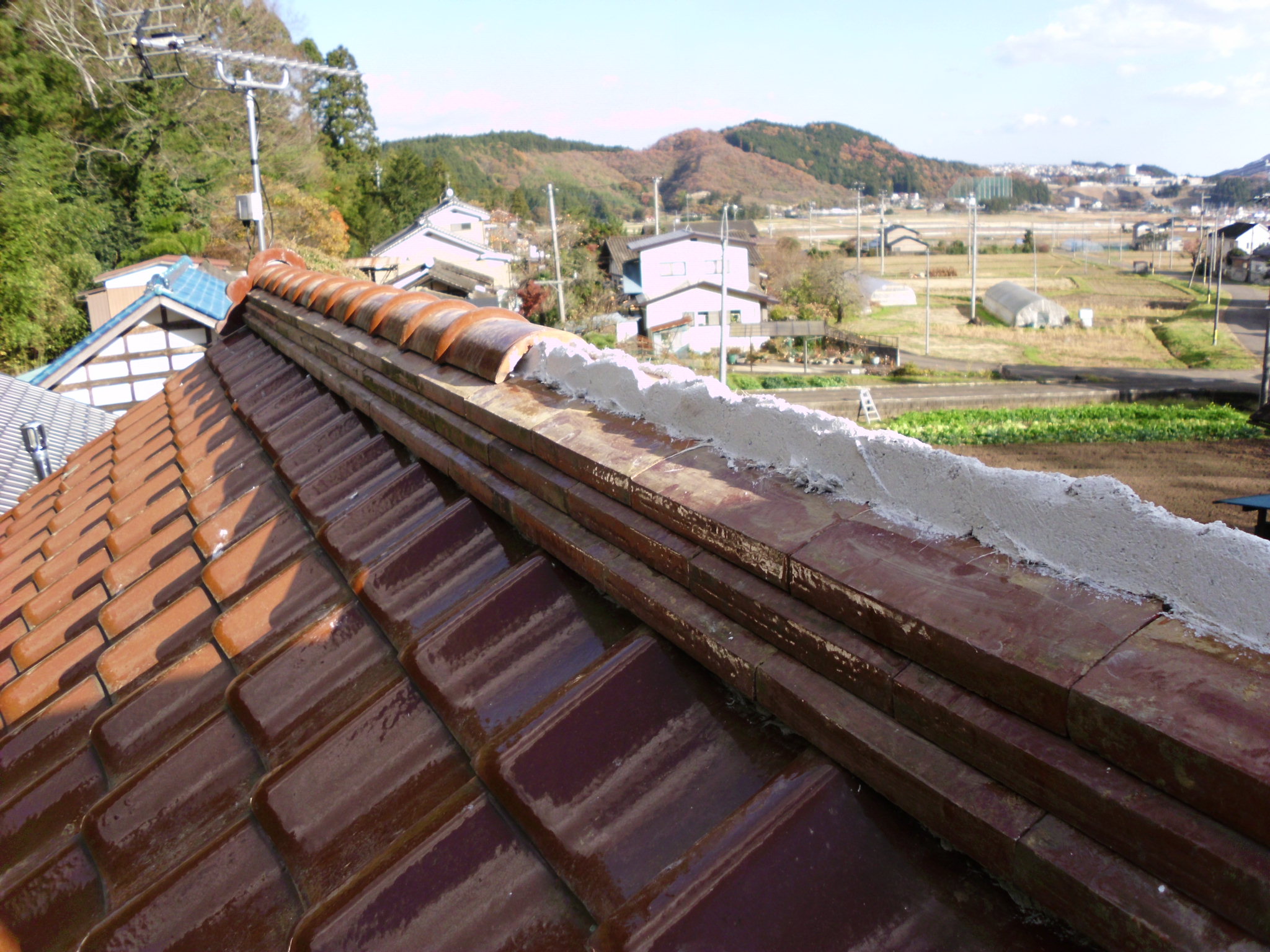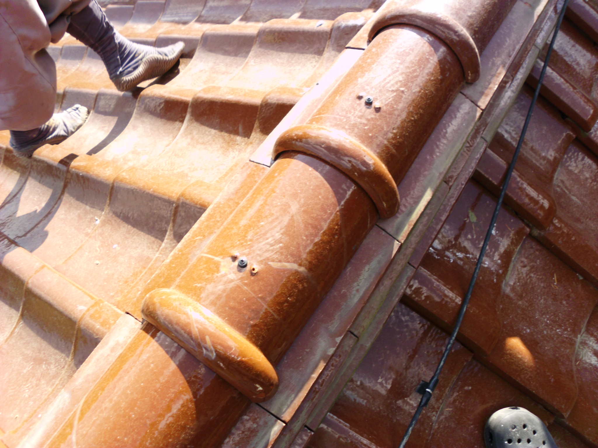 現在の瓦の積み方は昔の工法よりも頑丈です。棟内部には角材を入れて金具で家本体と固定します。そして、ビスで瓦を締め付けますので強度は断然増しています。さらに粘土の代用品として樹脂を混合したモルタル系の材料を使用するので防水性も高まっています。