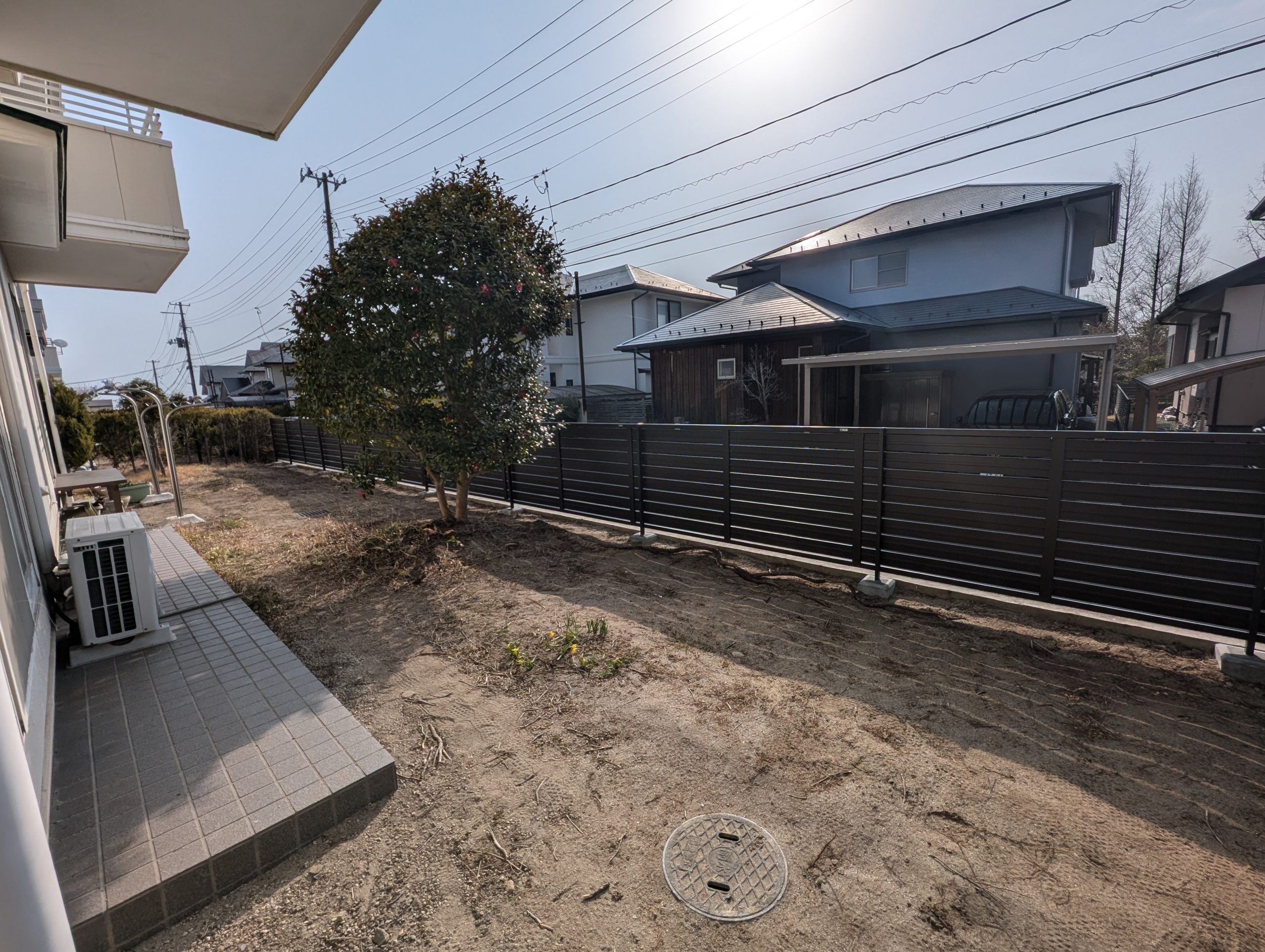 西側のフェンスはお隣さんとの境界のためにネットフェンスにしました。圧迫感が出すぎずに区切れます。