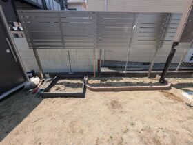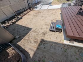 施工場所の雑草や石を取り除き、砂で地面を平らに調整して、防草シートを敷きこみます。
