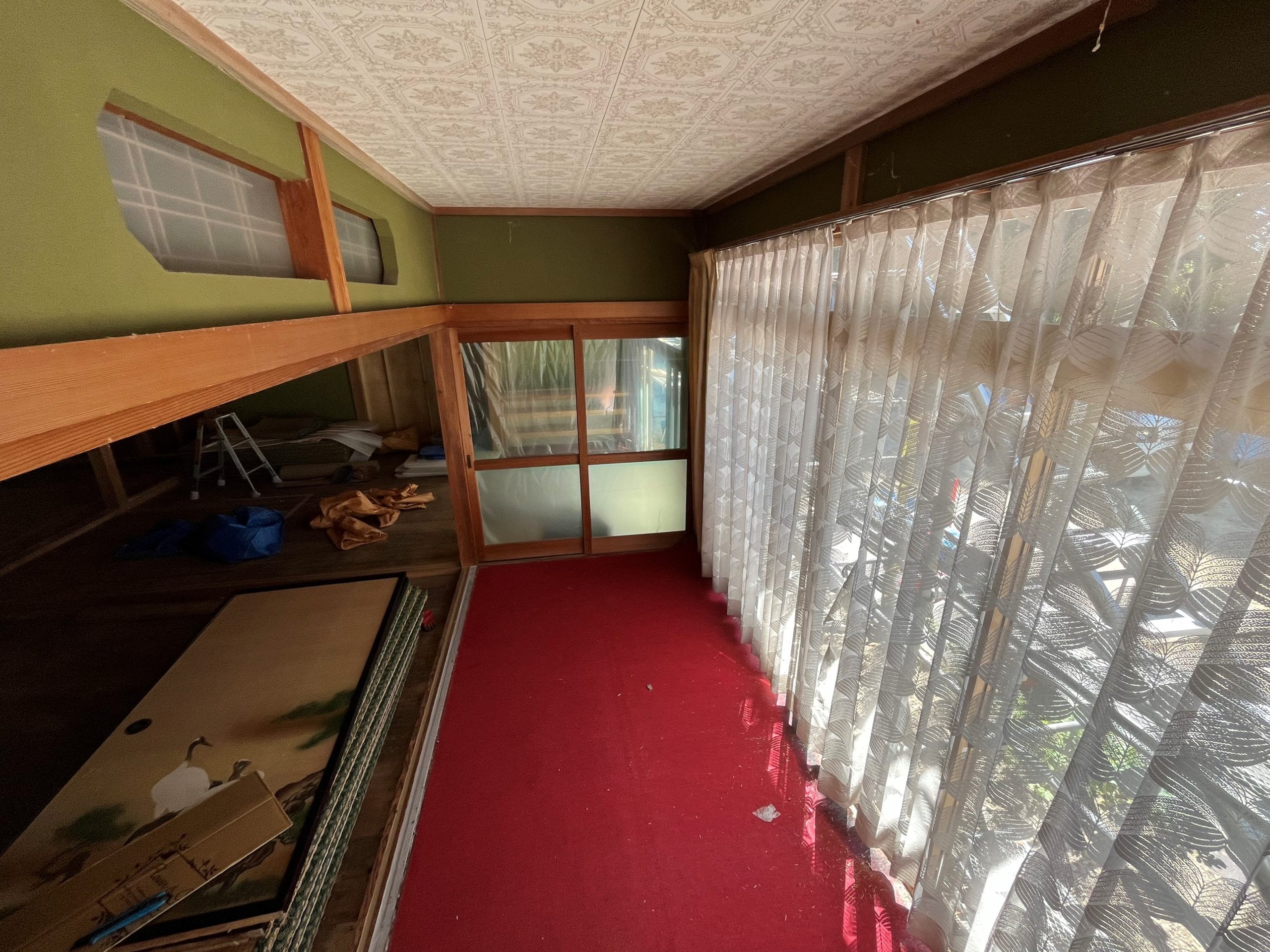 赤いカーペットの縁側に玄関を、欄間のある和室の前に廊下を配置しました。