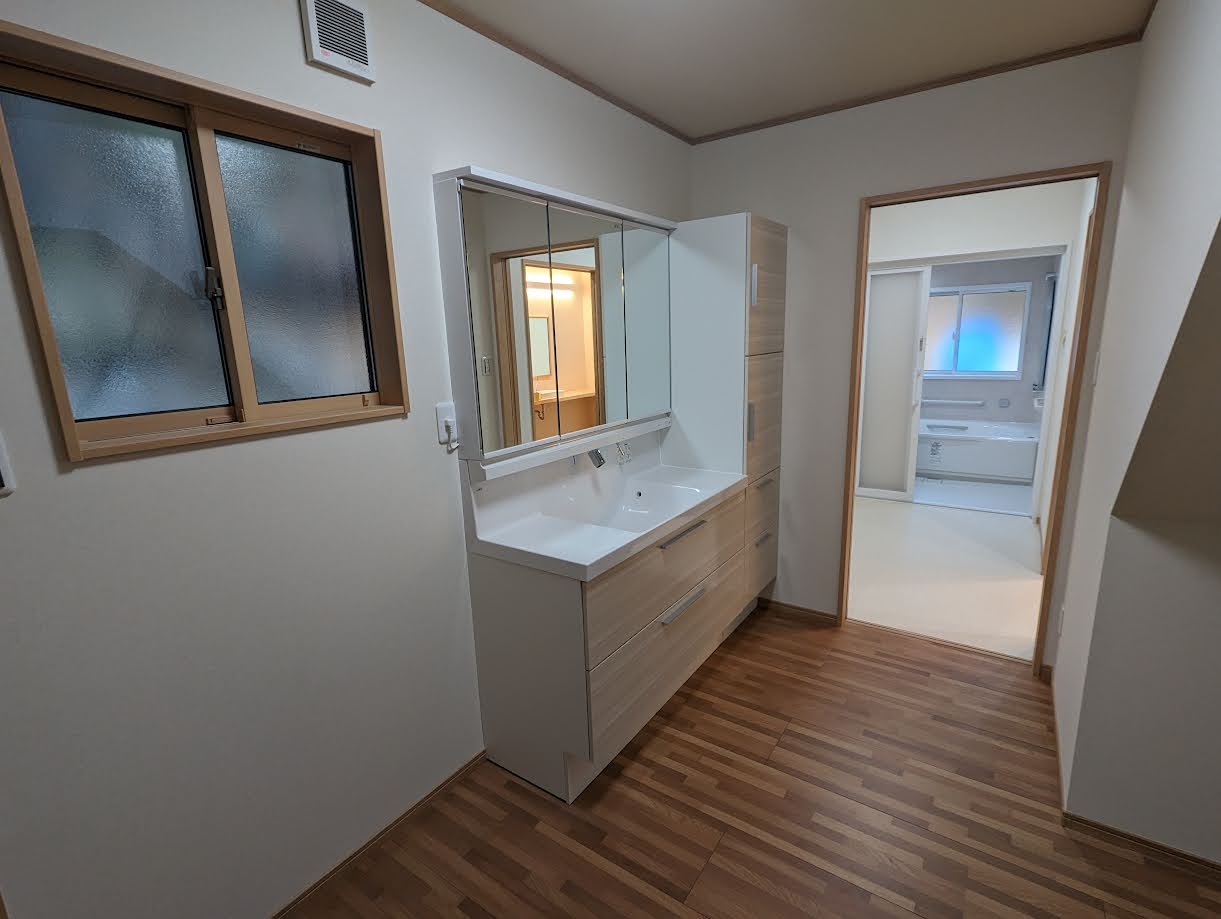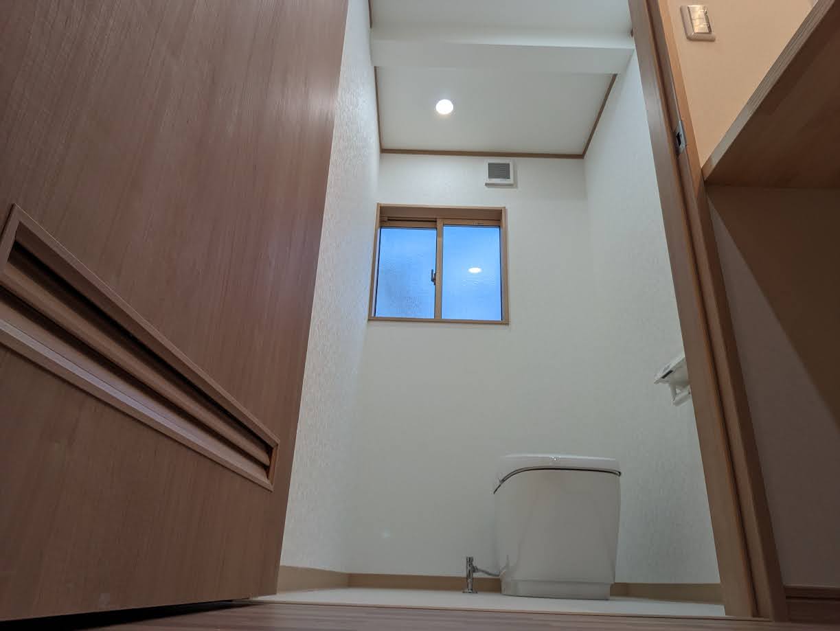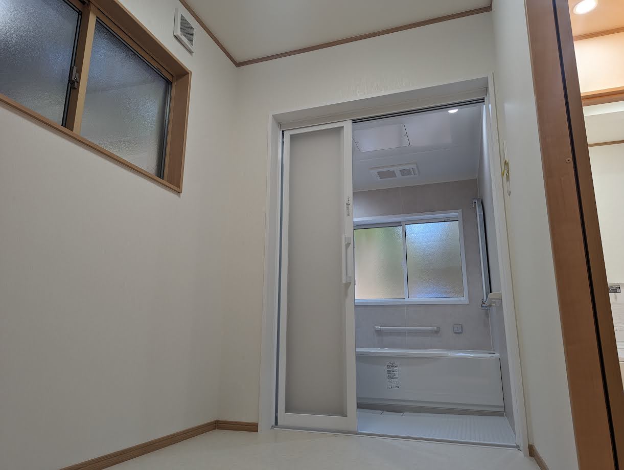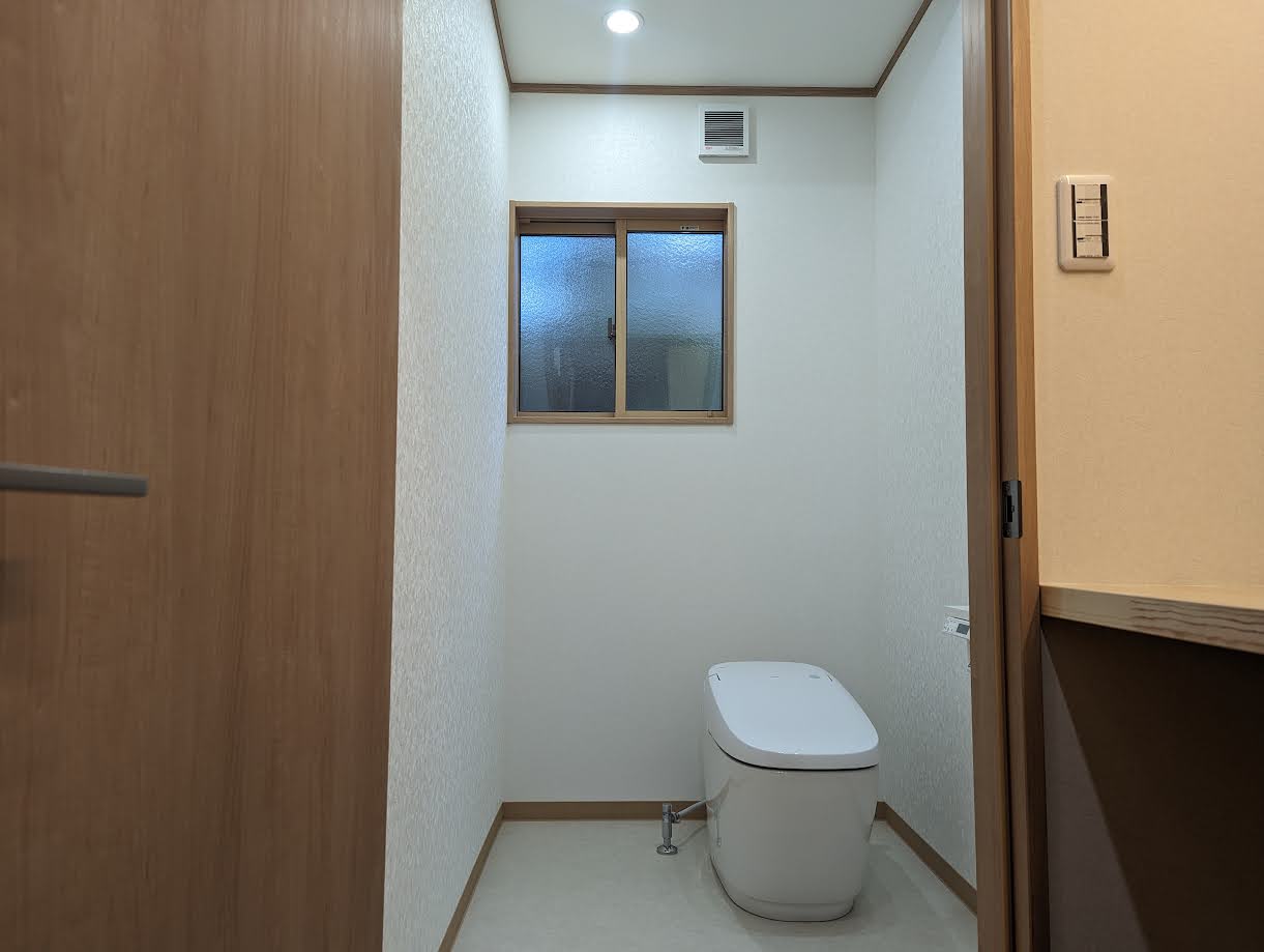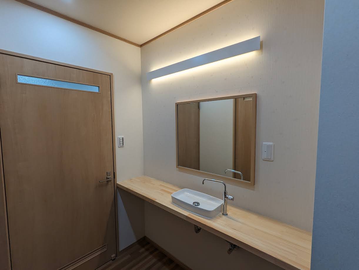 和室の一部をトイレにと浴室に。トイレ前の手洗いのカウンターは補強して手すり代わりにできます。トイレスペースは広めに作って隣で解除できるように配置しています。