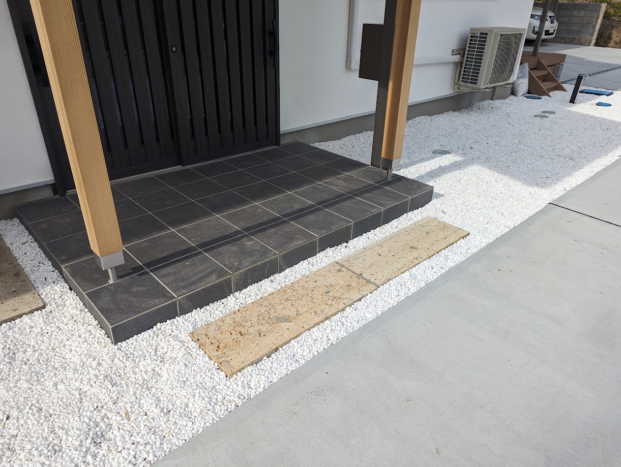 秋保石を使ってみたくて玄関ポーチ手前に飛び石として敷きました。雰囲気つくりに白の玉砂利でデコっております(*^-^*)