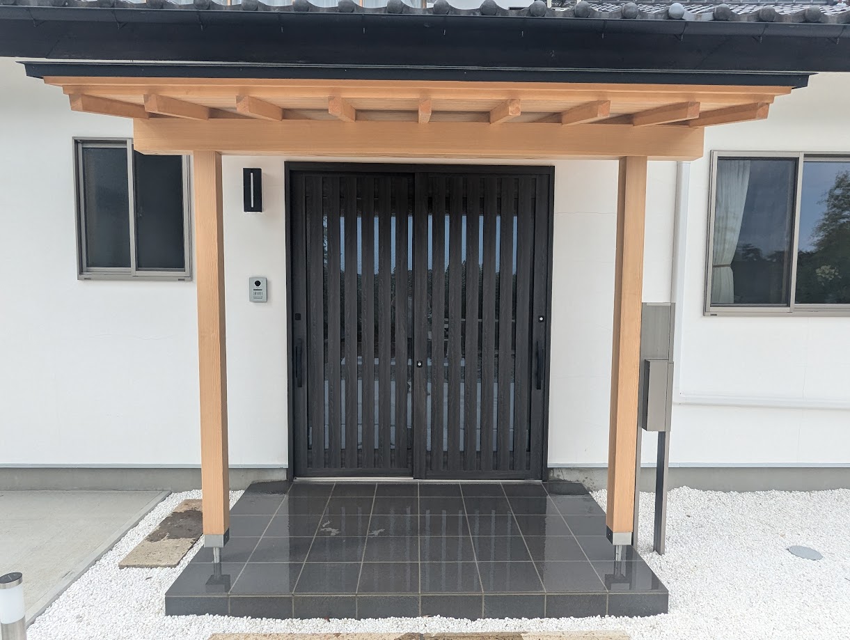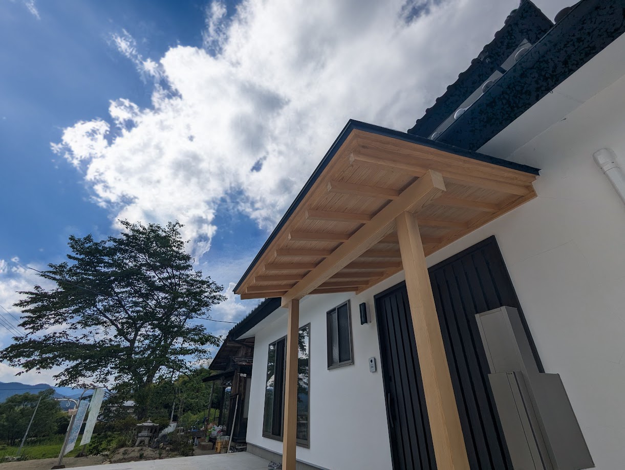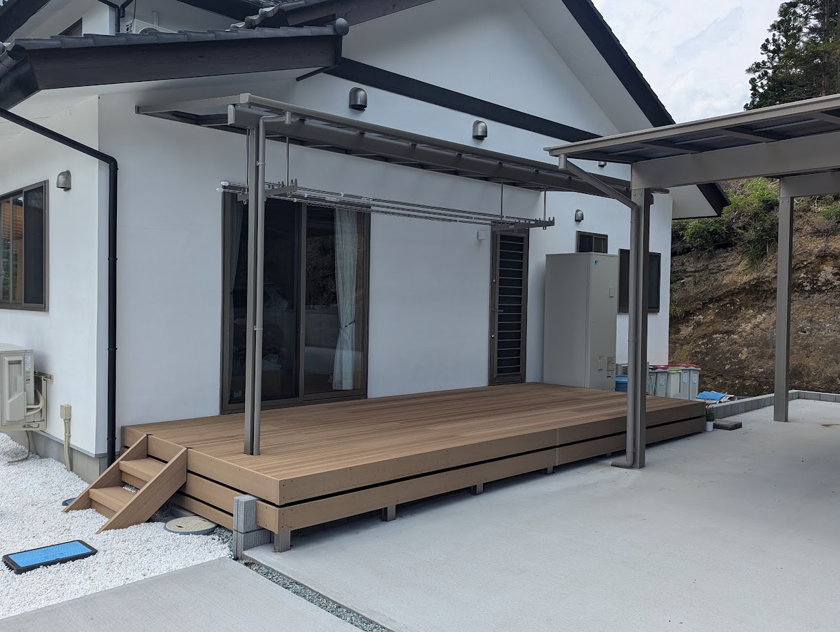 築70年は超えている納屋を解体して 改築後のリビングの掃き出し窓とキッチン勝手口にデッキテラスを設置して隣にカーポートを設置しました。屋外のデッキを利用して行き止まりのない間取りにしました。テラスから直接カーポートに行けるので雨天時の車の乗り降りも楽になると思います。