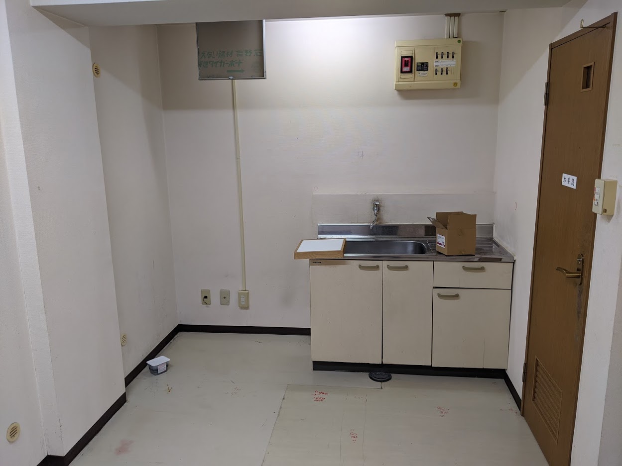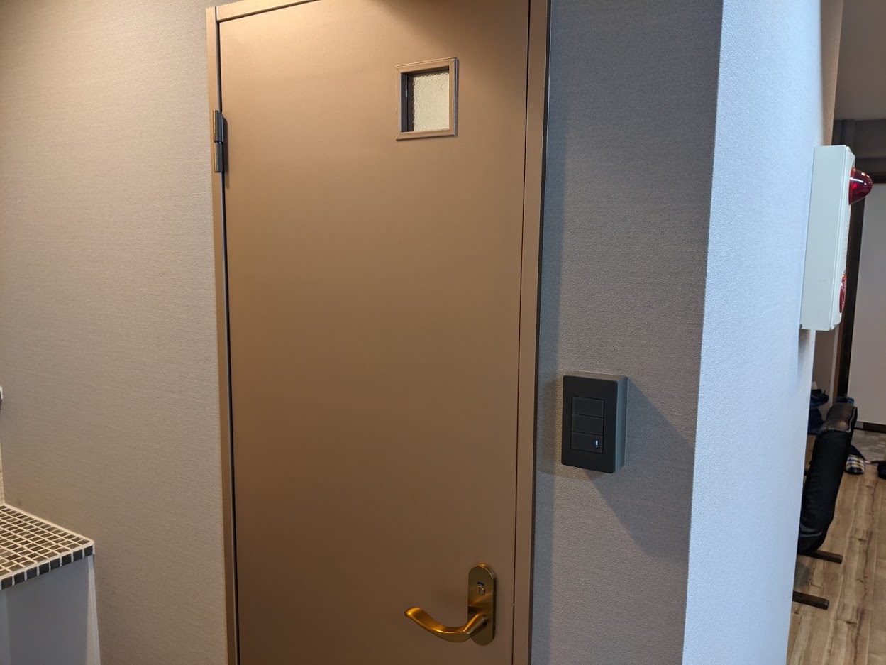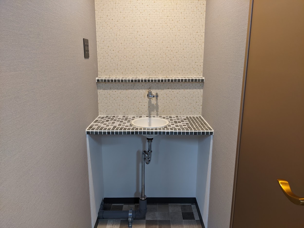 手洗いと給湯を間仕切りで分けました。ドアにメタル調のフィルムを施工してみました。木彫のドアが主流ですがメタル調のドアも個人的にはよいと感じます。