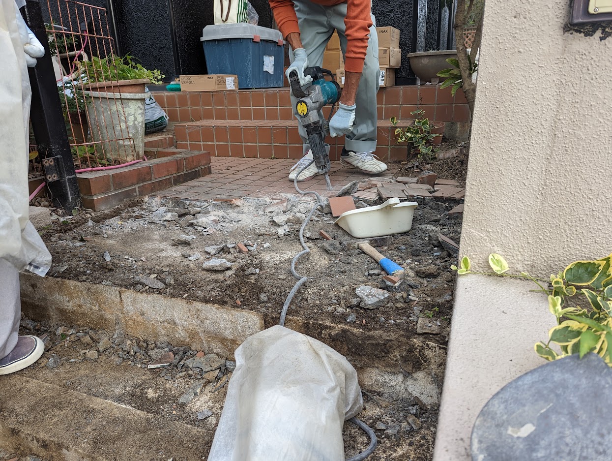 階段角のタイルは雪かきで弱ってよく崩れています。階段だけ張り替えると上手に縁が切れないので、何ともなさそうなフラットのところまで施工します。